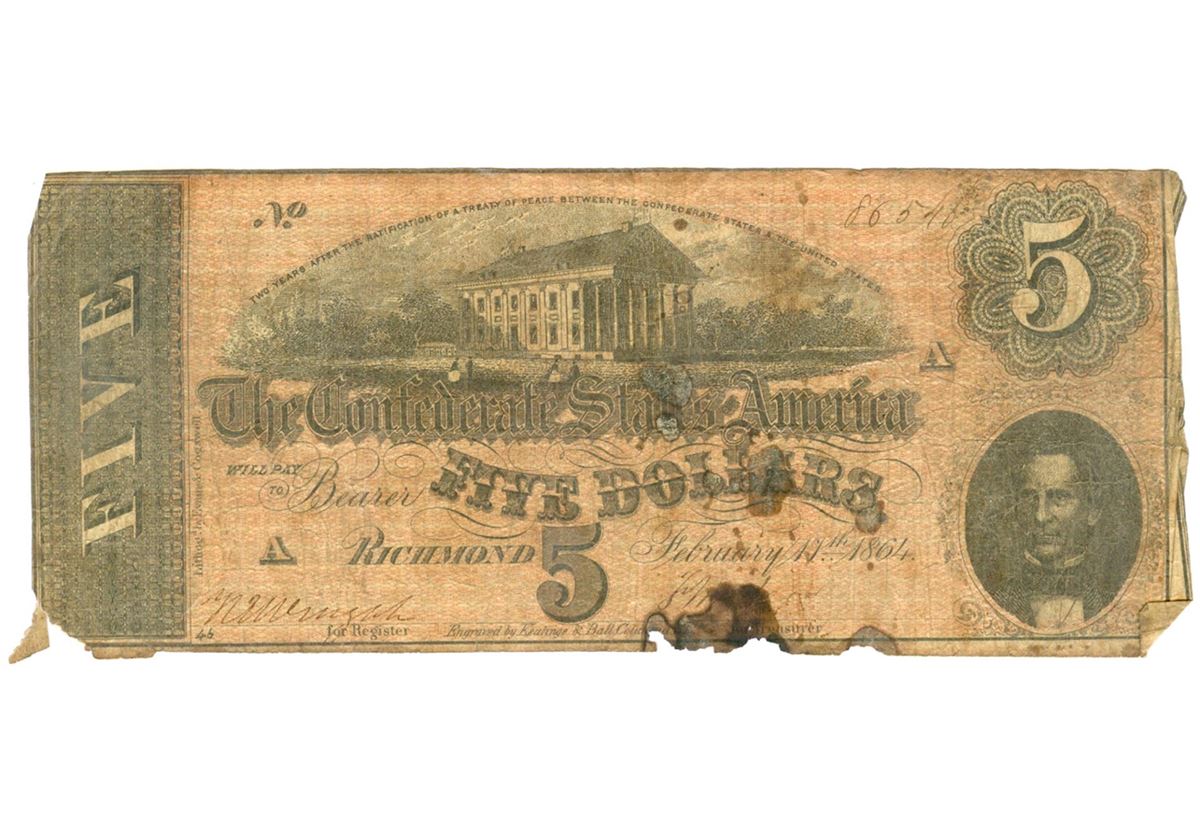 One $5 1864 Richmond Virginia Confederate States of America Bank Note.
