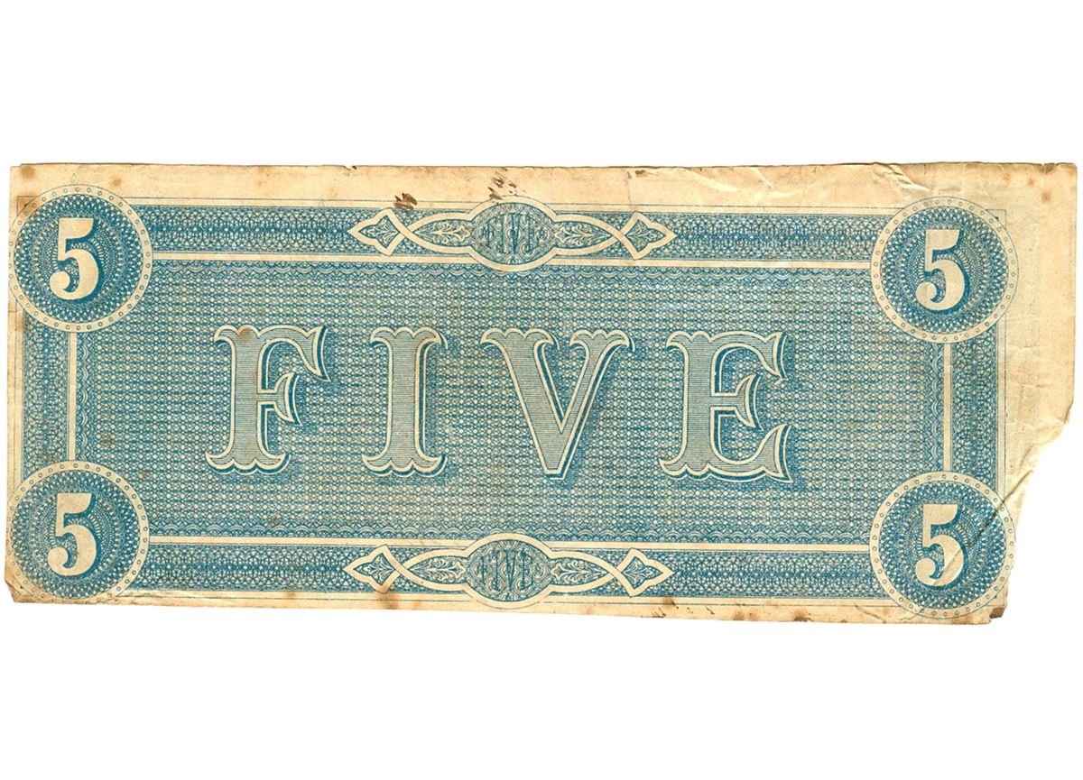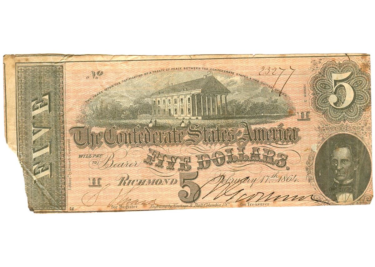 One $5 1864 Richmond Virginia Confederate States of America Bank Note.