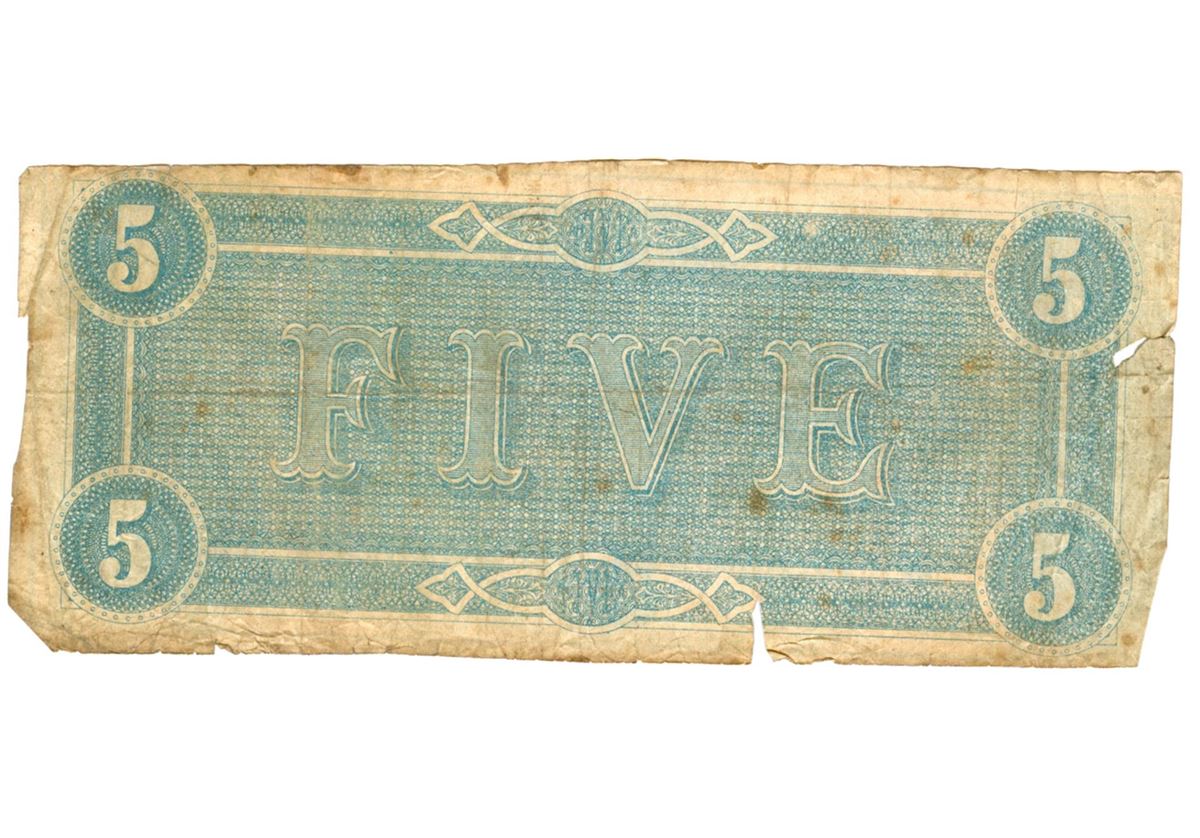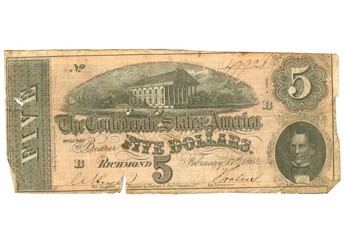 One $5 1864 Richmond Virginia Confederate States of America Bank Note.
