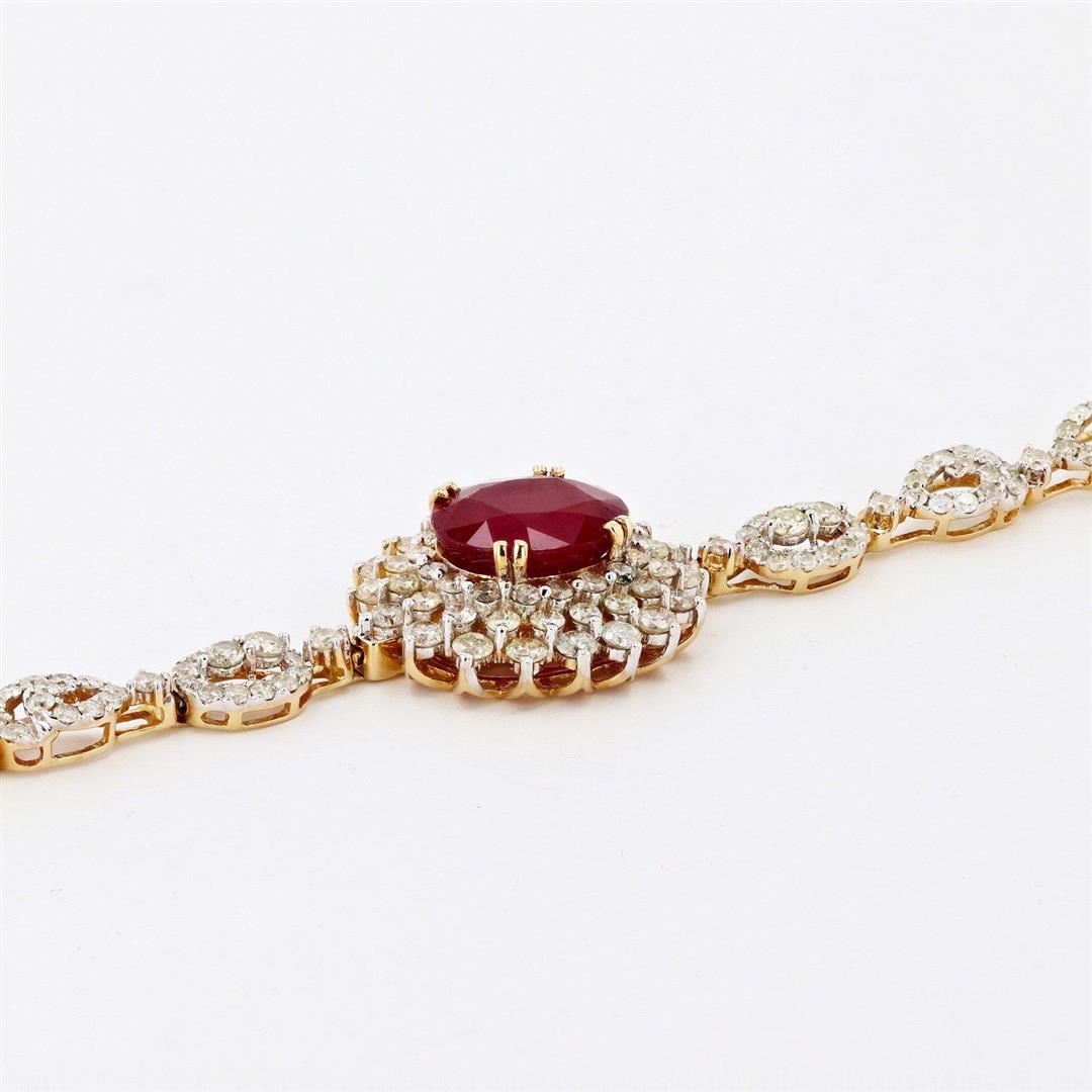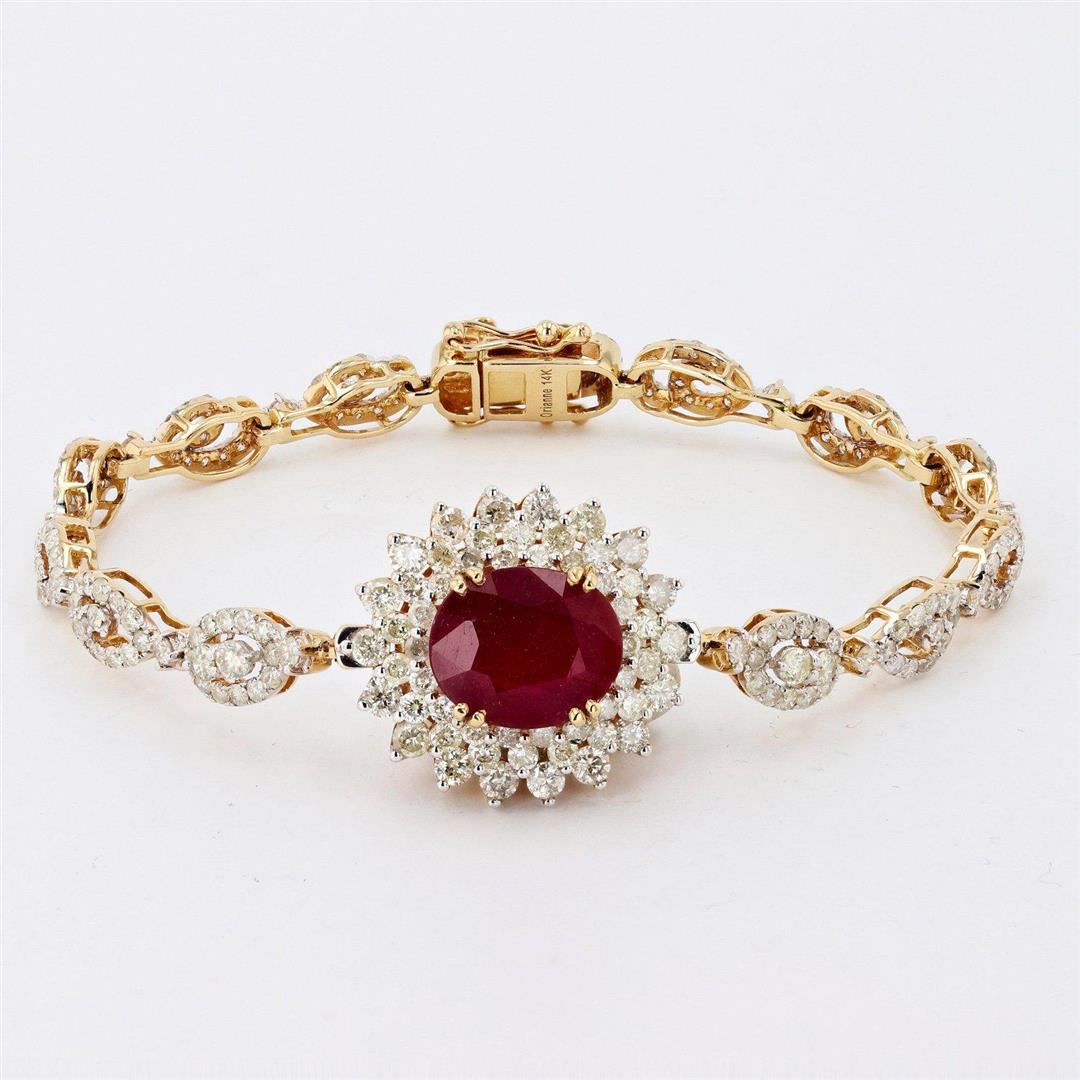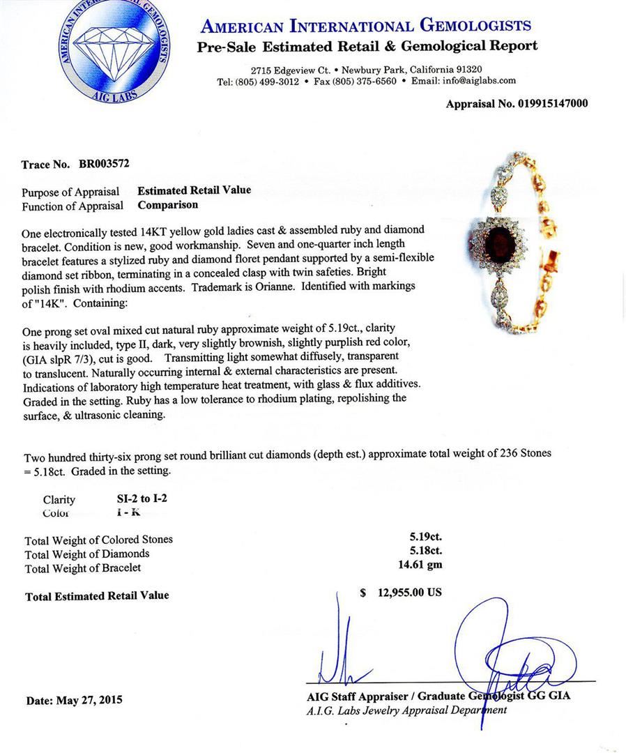 One electronically tested 14KT yellow gold ladies cast & assembled ruby and diamond bracelet. Condition is new, good workmanship. Seven and one-quarter inch length bracelet features a stylized ruby and diamond floret pendant supported by a semi-flexible diamond set ribbon, terminating in a concealed clasp with twin safeties. Bright polish finish with rhodium accents. Trademark is Orianne. Identified with markings of "14K". Containing: One prong set oval mixed cut natural ruby approximate weight of 5.19ct., clarity is heavily included, type II, dark, very slightly brownish, slightly purplish red color, (GIA slpR 7/3), cut is good. Transmitting light somewhat diffusely, transparent to translucent. Naturally occurring internal & external characteristics are present. Indications of laboratory high temperature heat treatment, with glass & flux additives. Graded in the setting. Ruby has a low tolerance to rhodium plating, repolishing the surface, & ultrasonic cleaning. Two hundred thirty-six prong set round brilliant cut diamonds (depth est.) approximate total weight of 236 Stones = 5.18ctw. Graded in the setting. Clarity SI2 to I2 Color I - K Total Weight of Colored Stones 5.19ct. Total Weight of Diamonds 5.18ctw. Total Weight of Bracelet 14.61 gm