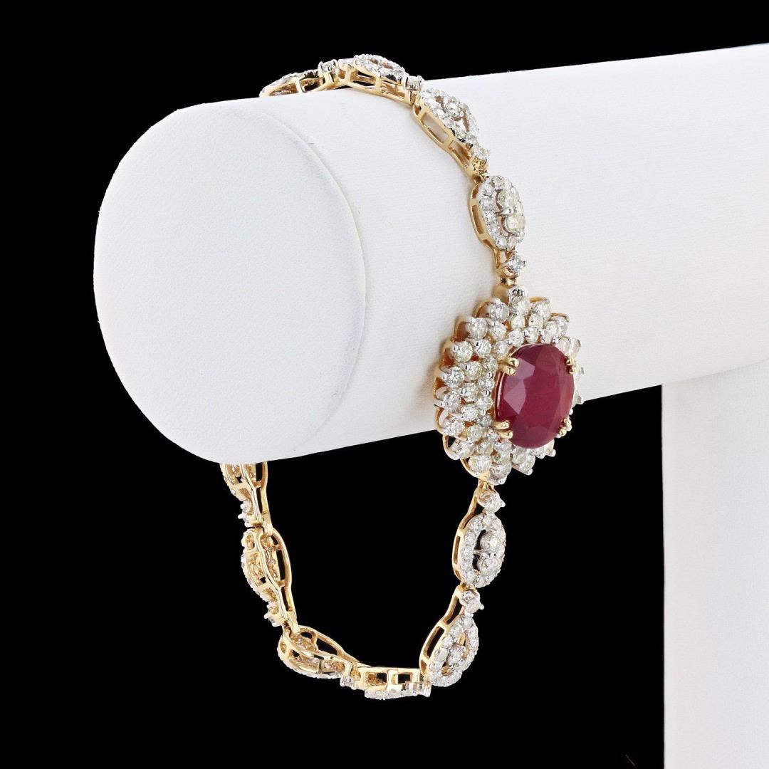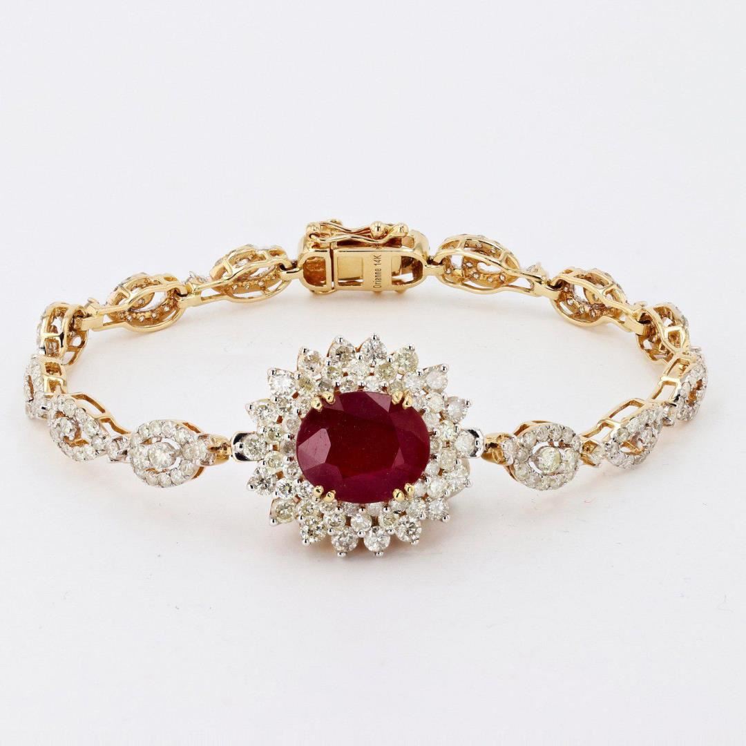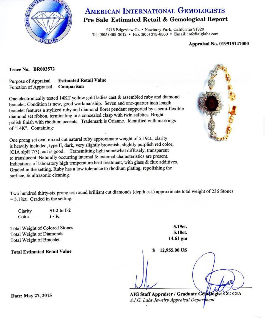 One electronically tested 14KT yellow gold ladies cast & assembled ruby and diamond bracelet. Condition is new, good workmanship. Seven and one-quarter inch length bracelet features a stylized ruby and diamond floret pendant supported by a semi-flexible diamond set ribbon, terminating in a concealed clasp with twin safeties. Bright polish finish with rhodium accents. Trademark is Orianne. Identified with markings of "14K". Containing: One prong set oval mixed cut natural ruby approximate weight of 5.19ct., clarity is heavily included, type II, dark, very slightly brownish, slightly purplish red color, (GIA slpR 7/3), cut is good. Transmitting light somewhat diffusely, transparent to translucent. Naturally occurring internal & external characteristics are present. Indications of laboratory high temperature heat treatment, with glass & flux additives. Graded in the setting. Ruby has a low tolerance to rhodium plating, repolishing the surface, & ultrasonic cleaning. Two hundred thirty-six prong set round brilliant cut diamonds (depth est.) approximate total weight of 236 Stones = 5.18ctw. Graded in the setting. Clarity SI2 to I2 Color I - K Total Weight of Colored Stones 5.19ct. Total Weight of Diamonds 5.18ctw. Total Weight of Bracelet 14.61 gm #LREF-5161