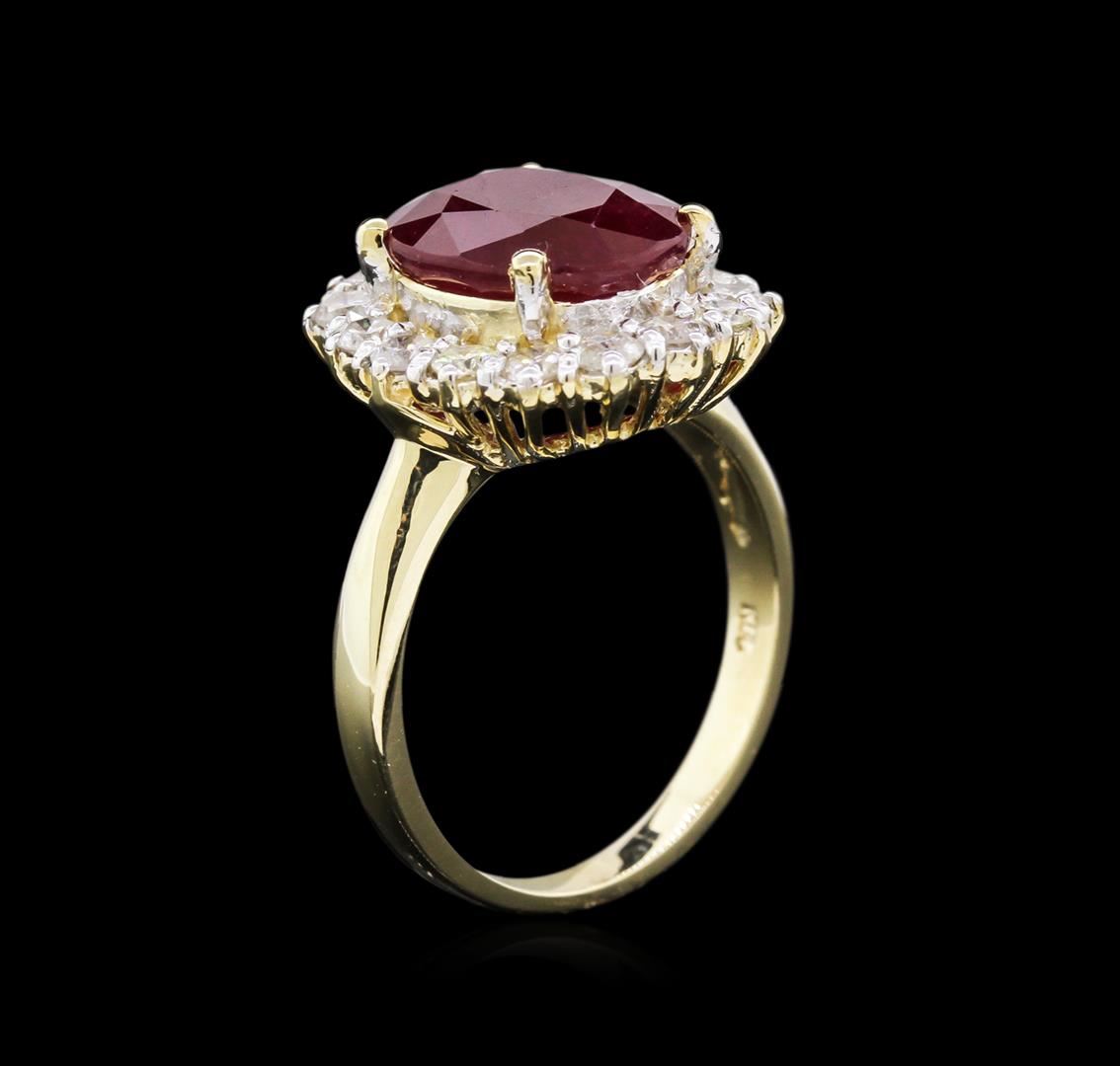 One electronically tested 14KT yellow gold ladies cast ruby and diamond ring. The featured ruby is set within a diamond bezel, completed by a two millimeter wide band. Bright polish finish with rhodium accents. Identified with markings of "K14". Condition is new, good workmanship. Containing: One prong set oval mixed cut natural ruby approximate weight of 5.19ct., clarity is heavily included, type II, dark, very slightly brownish, slightly purplish red color, (GIA slpR 7/3), cut is good. Transmitting light somewhat diffusely, transparent to translucent. Naturally occurring internal & external characteristics are present. Indications of laboratory high temperature heat treatment, with glass & flux additives. Graded in the setting. Ruby has a low tolerance to rhodium plating, repolishing the surface, & ultrasonic cleaning. Sixteen prong set round brilliant cut diamonds, measuring 2.40 - 2.30 x 1.41mm (depth est.) approximate total weight of 16 Stones = 0.85ct. Graded in the setting. Clarity: I-1 to I-2. Color: H - J. Total Weight of Colored Stones 5.19ct. Total Weight of Diamonds 0.85ct. AIG Appraised at $3,455.00.