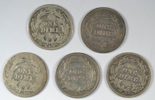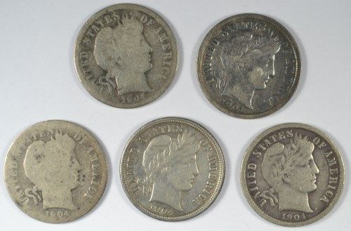 5-1904 BARBER DIME "GRADING SET" ( AG,GOOD,VG,FINE,VF)