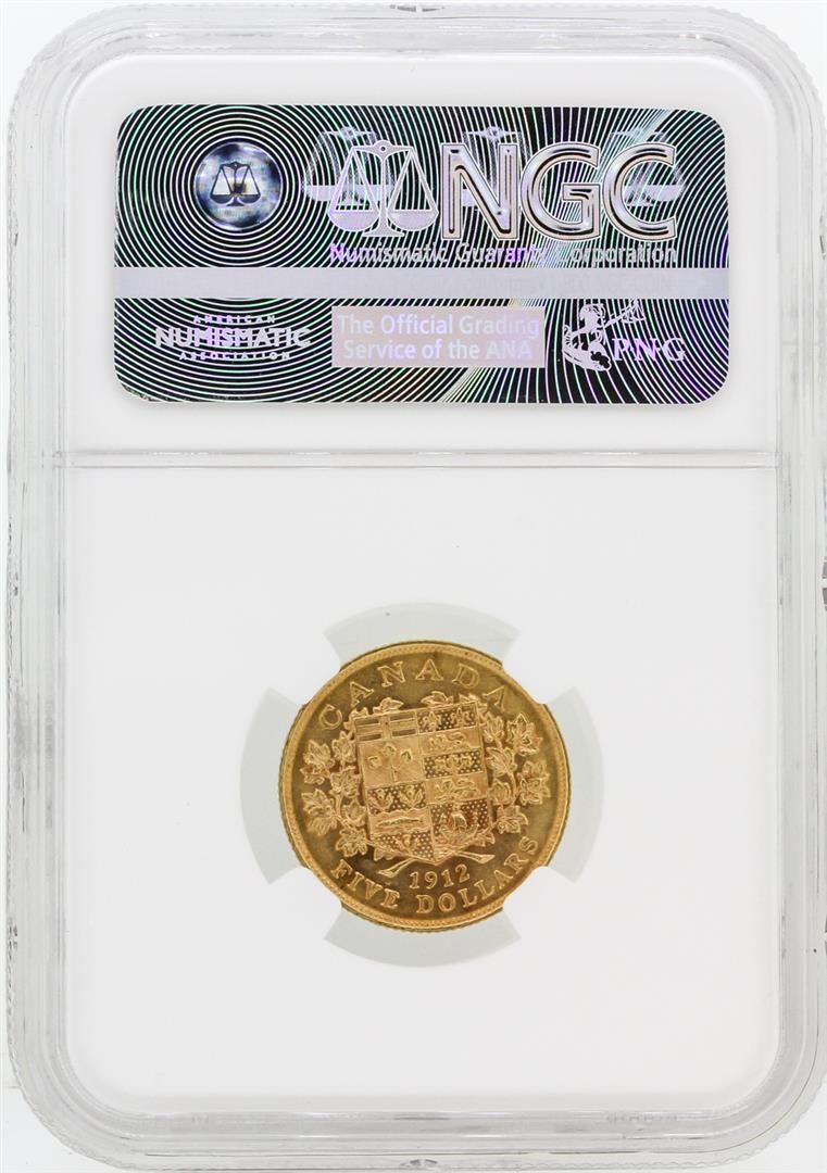 One $5 1912 NGC AU55 Canada Gold Coin. NGC Certified.