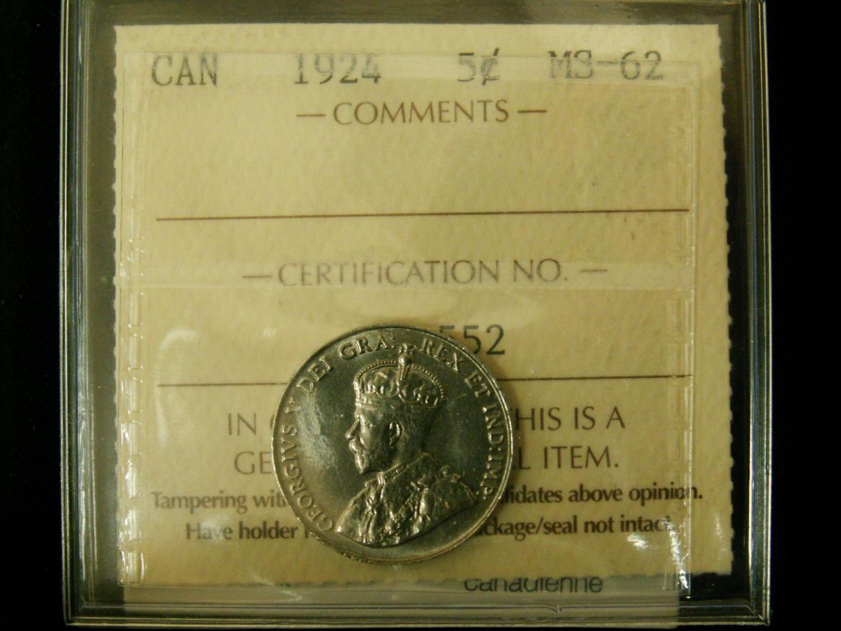 5¢ 1924 ICCS MS62. A nice example with full beads.