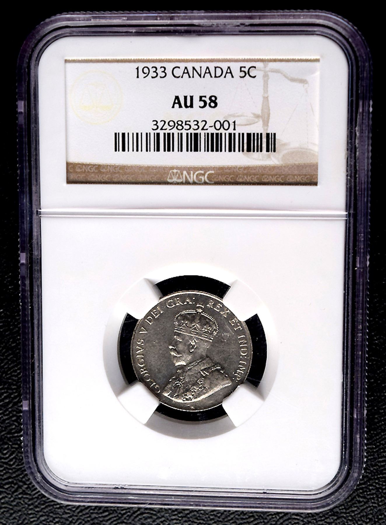 Canada, Five Cents Nickel, 1933. Certified NGC AU-58. Catalogue $225 cdn