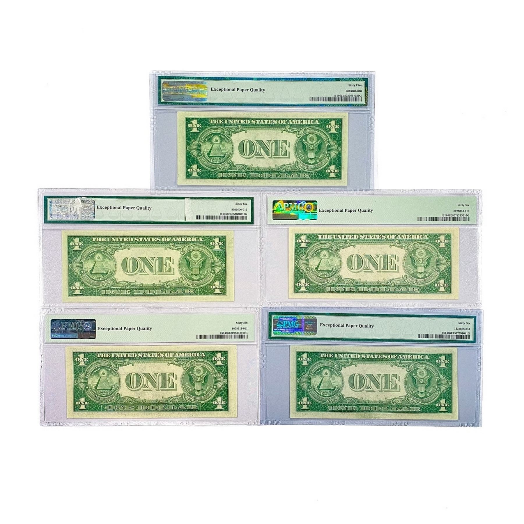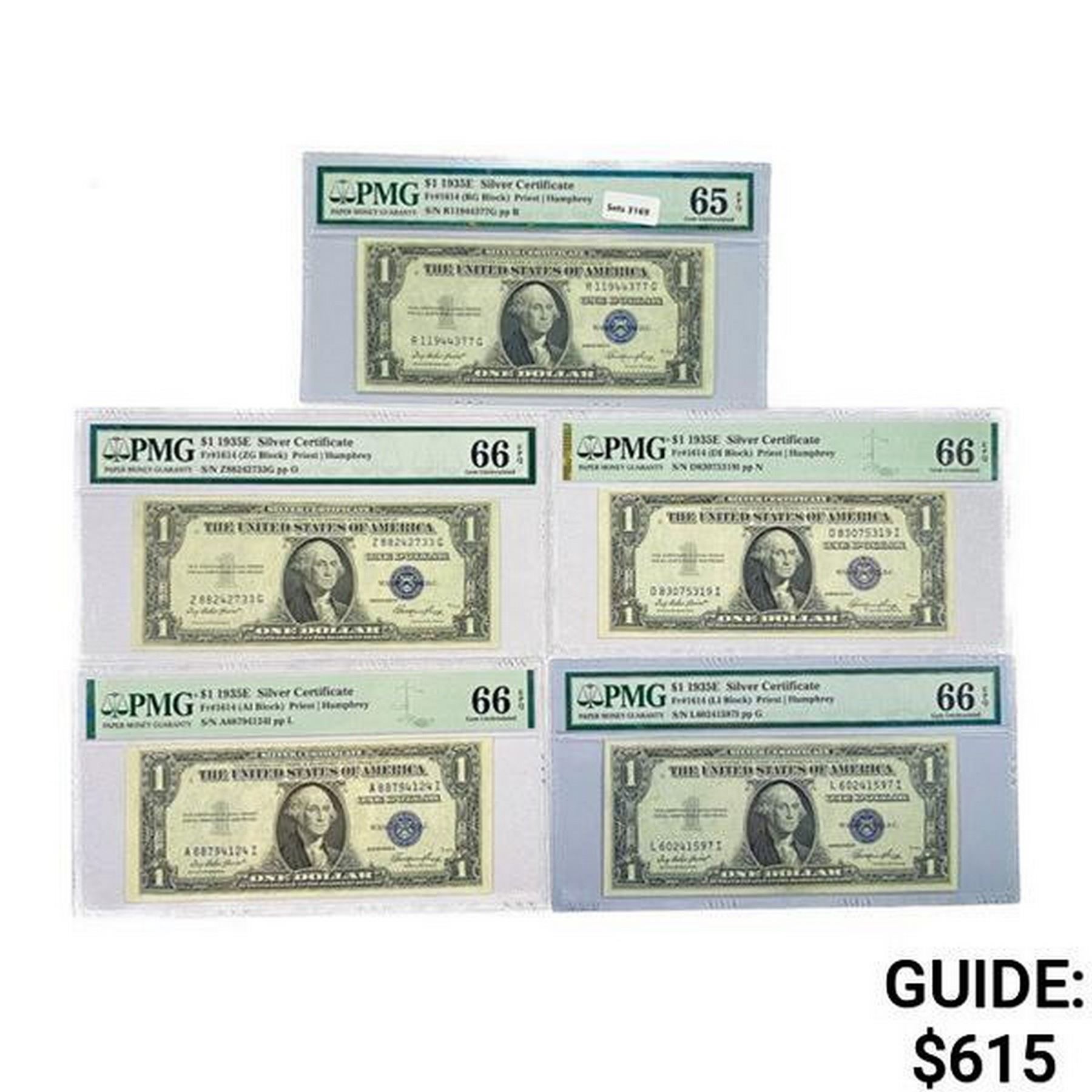 (5) 1935 E $1 Silver Cert.'s PMG GEM UNC 65-66