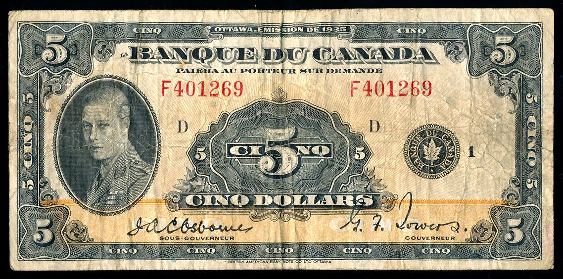 Bank of Canada, Five Dollars, 1935, French Text, BC-6, series D, VG+++. S/N : F401269, Osborne/Towers. Catalogue $250 cnd