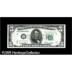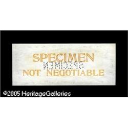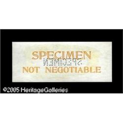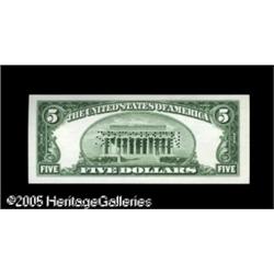 <B>$5 1950 Face and Back Set. Superb Gem New.</B></I> The first set in an incredible series of specimen notes. Both face and back are printed on medium-weight card with the face having the solid zeros serial number. Both face and back are punch cancelled with the word specimen spelled out in small holes across their central portions. The blank back of each piece is printed "SPECIMEN NOT NEGOTIABLE" in tan. The blank backs also show very minor traces of glue from a prior mounting. 2 notes Lot:15568