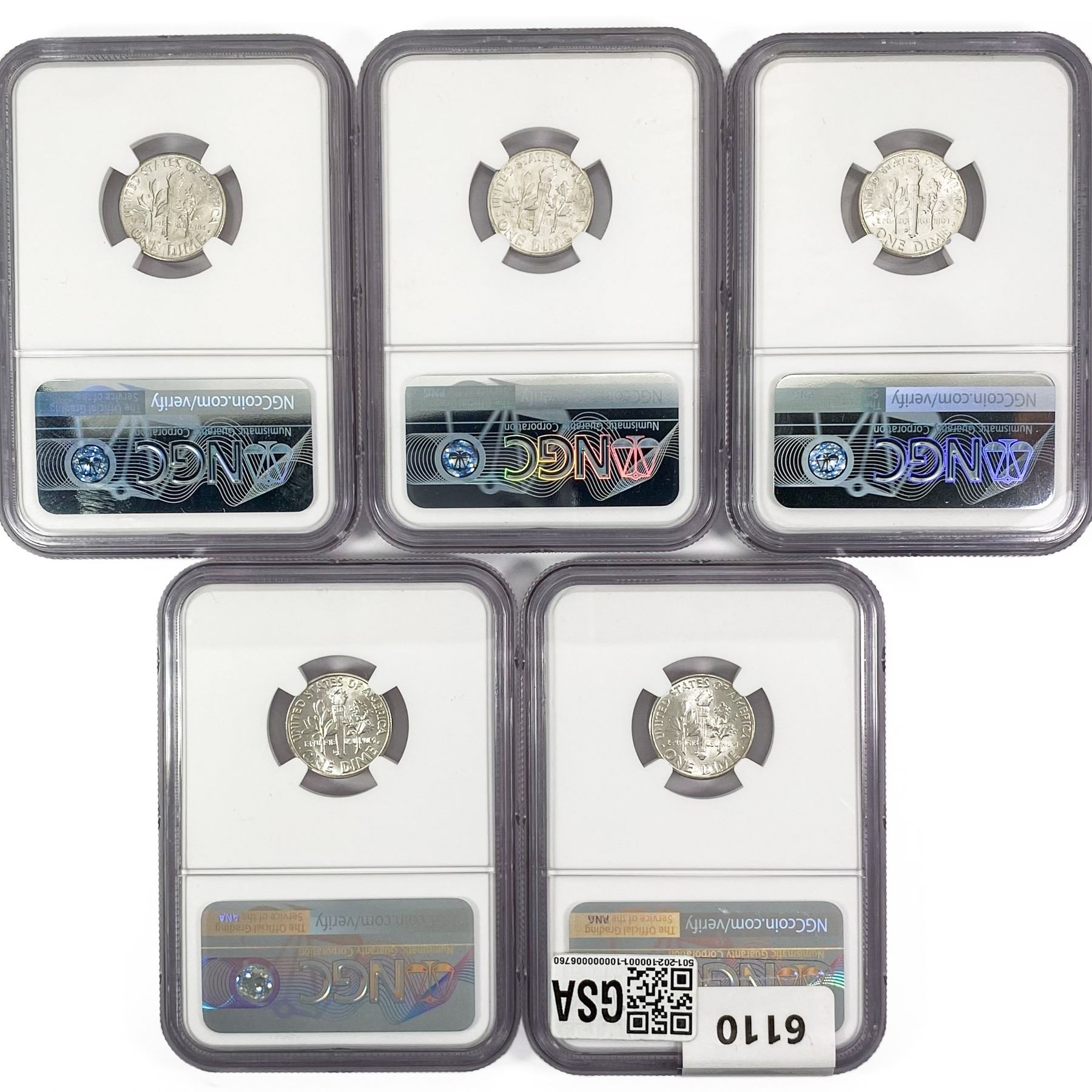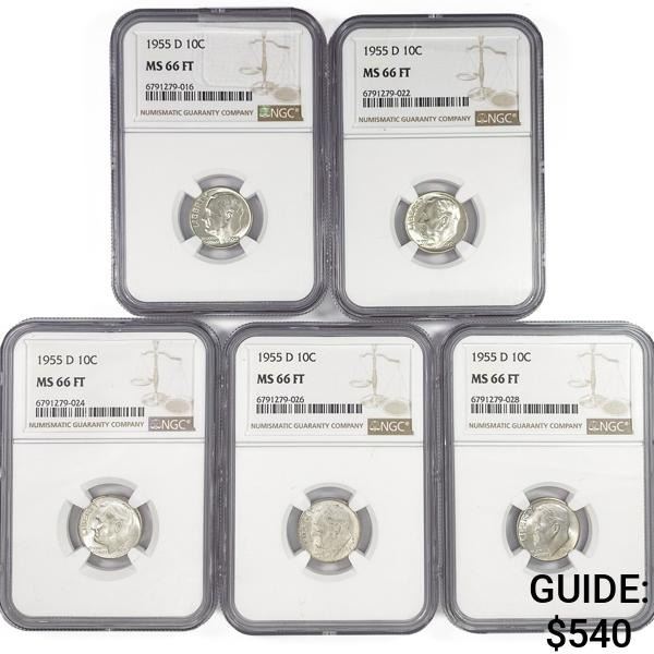 (5) 1955-D Roosevelt Silver Dimes NGC MS66 FT