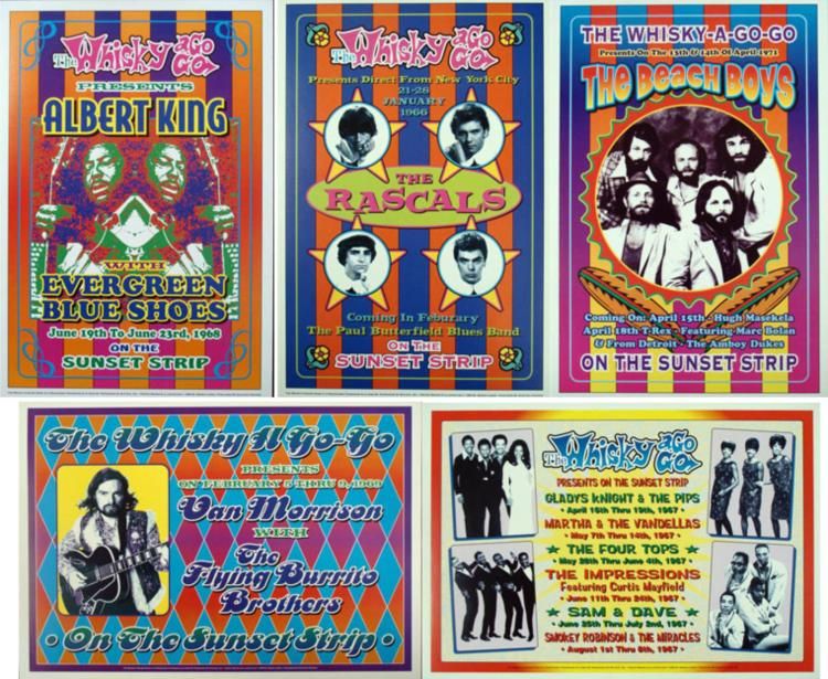 Here is a group of 5 reproductions of original concert posters from The Whisky a Go Go in Los Angeles, featuring a variety of the 1960's sound. Size: 13 1/2" x 20" (approximately) Medium: Heavy Poster Stock Condition: Excellent The artists include: The Beach Boys, 1971Van Morrison with The Flying Burrito BrothersAlbert King, 1968The Rascals, 1967Motown (six separate upcoming 1967 shows) with Gladys Knight & The Pips, Martha & The Vandellas, The Four Tops, The Impressions, Sam & Dave, Smokey Robinson & The Miracles Please note: These are reproductions printed in 1999, not original concert posters