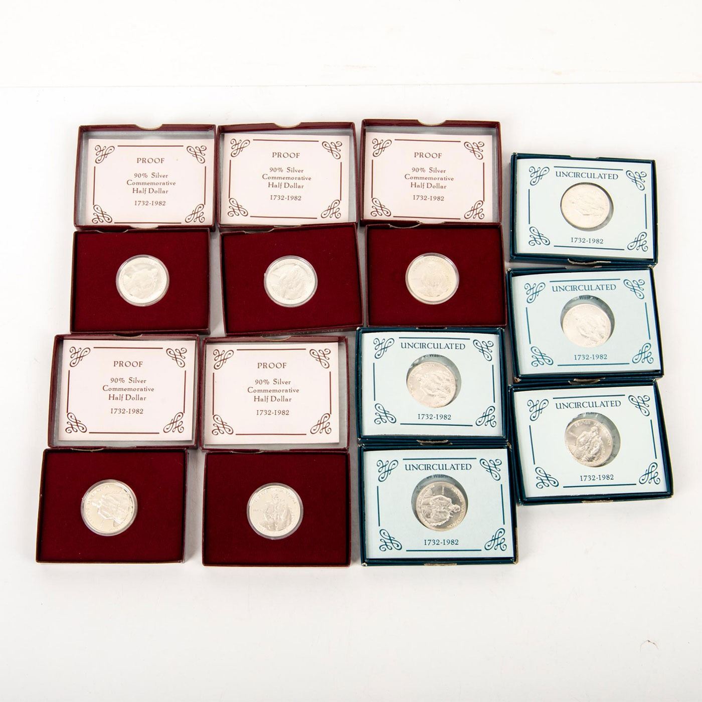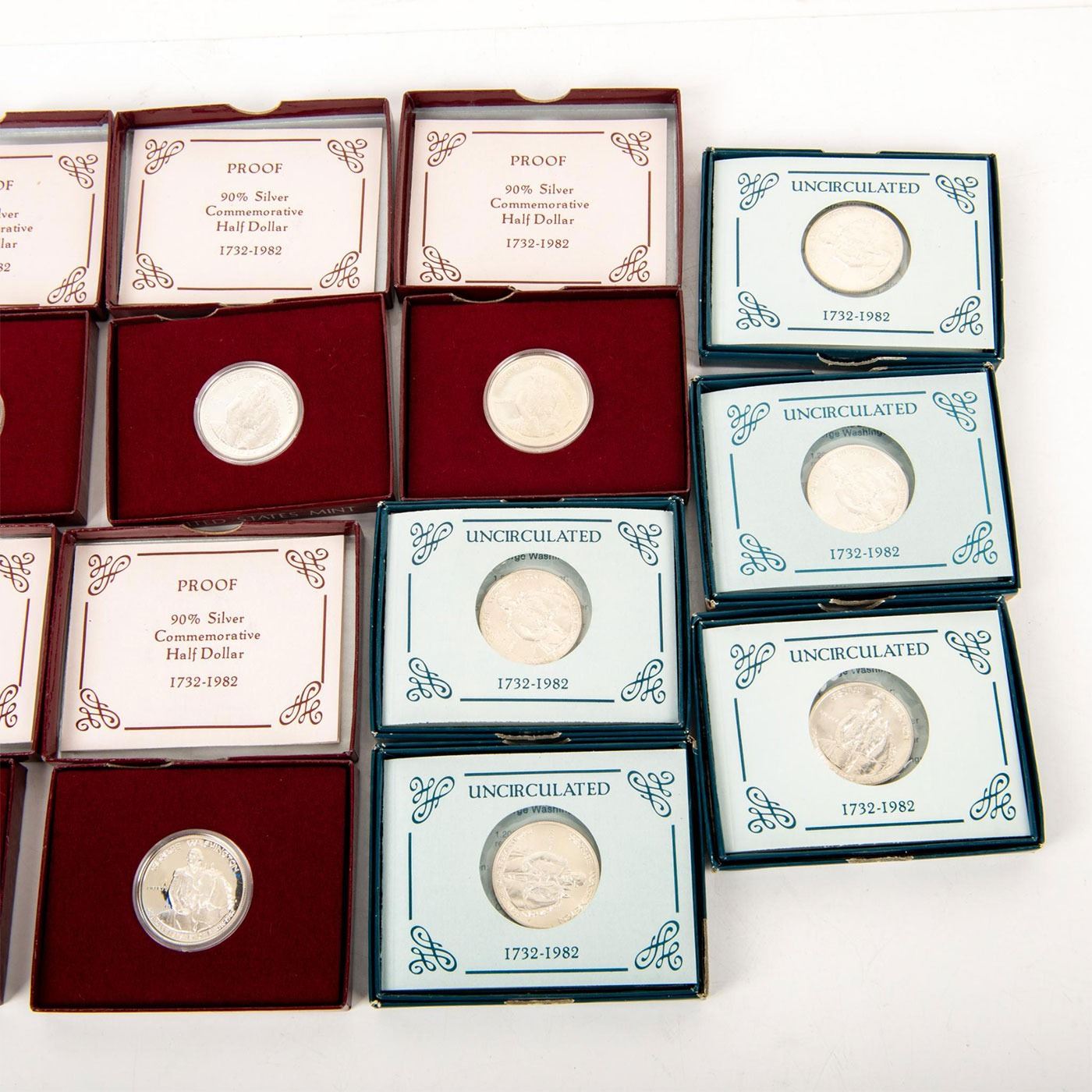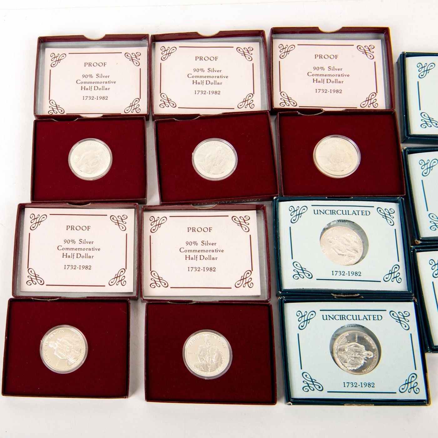 1982 George Washington commemorative half dollar series. These uncirculated coins have a "D" mint mark on them. The Proof have an "S" mint mark on them. All of them have orginial certificates and boxes. Coins and Currency, Numismatists
