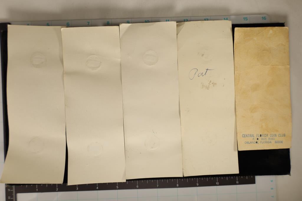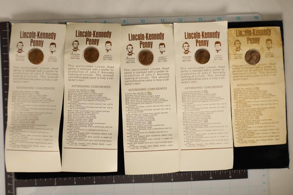 AN INFORMATIONAL CARD AND HAS AN ETCHING OF KENNEDY TO THE RIGHT OF LINCOLN.
