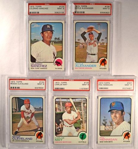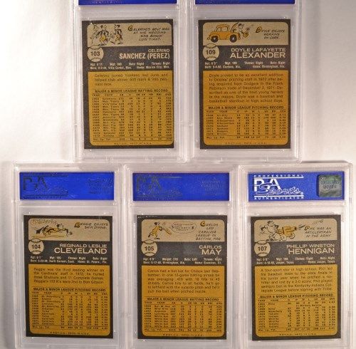#103 Celerino Sanchez, #104 Reggie Cleveland, #105 Carlos May, #107 Phil Hennigan, #109 Doyle Alexander. Est. Value $125.00 - $150.00.