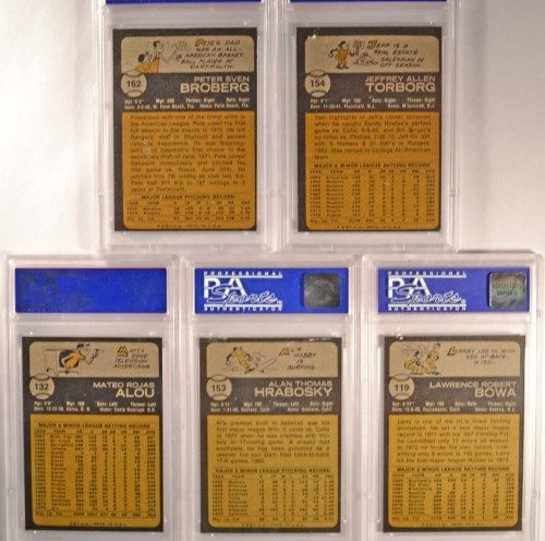 #119 Larry Bowa, #132 Matty Alou, #153 Al Hrabosky. #154 Jeff Torborg, #162 Pete Broberg. Est Value $125.00 - $150.00.