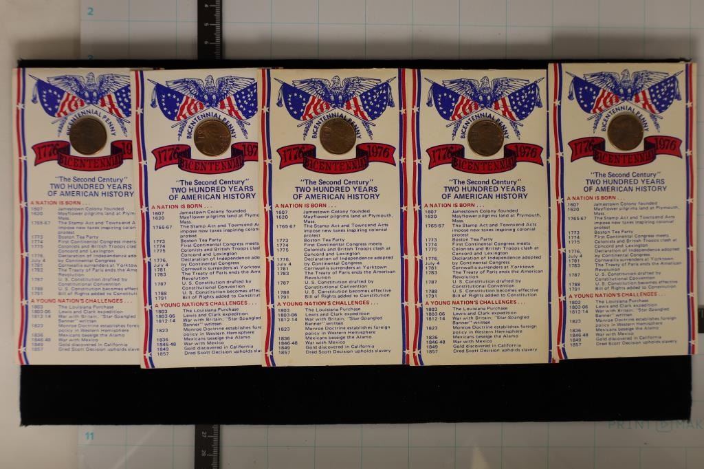 STAMP OF USA ON THE PENNY ON THE RIGHT AND THE LIBERTY BELL ON THE LEFT ALL UNC ON INFO CARDS