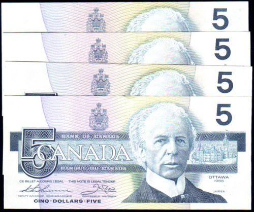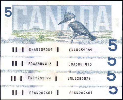 Bank of Canada Five Dollars 1986, Crow-Bouey, BC-56a, three notes Prefixes ENA, ENL and EOA, all AU and better. Plus Five Dollars 1986, Thiessen-Crow, BC-56b EPC4202601, EF. A total of four notes