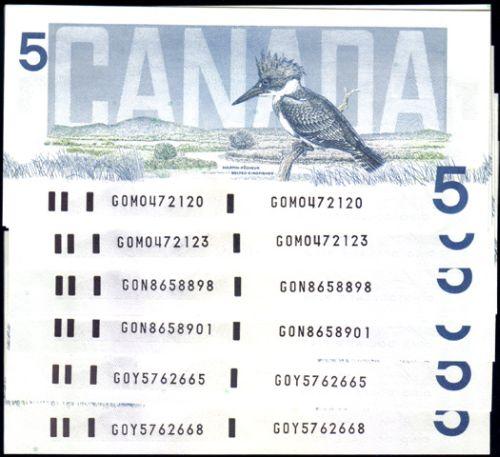 Bank of Canada Five Dollars 1986, Bonin-Thiessen, BC-56c. Four consecutive notes GOM01472120 to 123, plus four consecutive notes GON8658898 to 901 and four consecutive notes GOY5762665 to 668. Total of twelve notes, all AU and Uncirculated, mostly Uncirculated