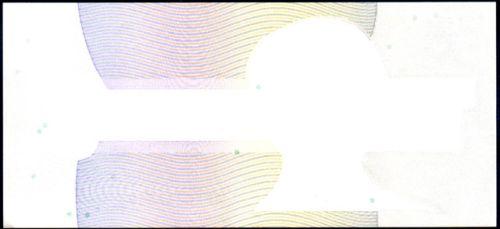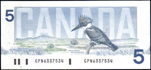 Bank of Canada Five Dollars 1986, Bonin-Thiessen, BC-56c with Missing Intaglio Printing Error, Serial Number GPN6337534. On the front, only the multi-colour background is present, with no black printing or signatures. The back is completely printed, Uncirculated