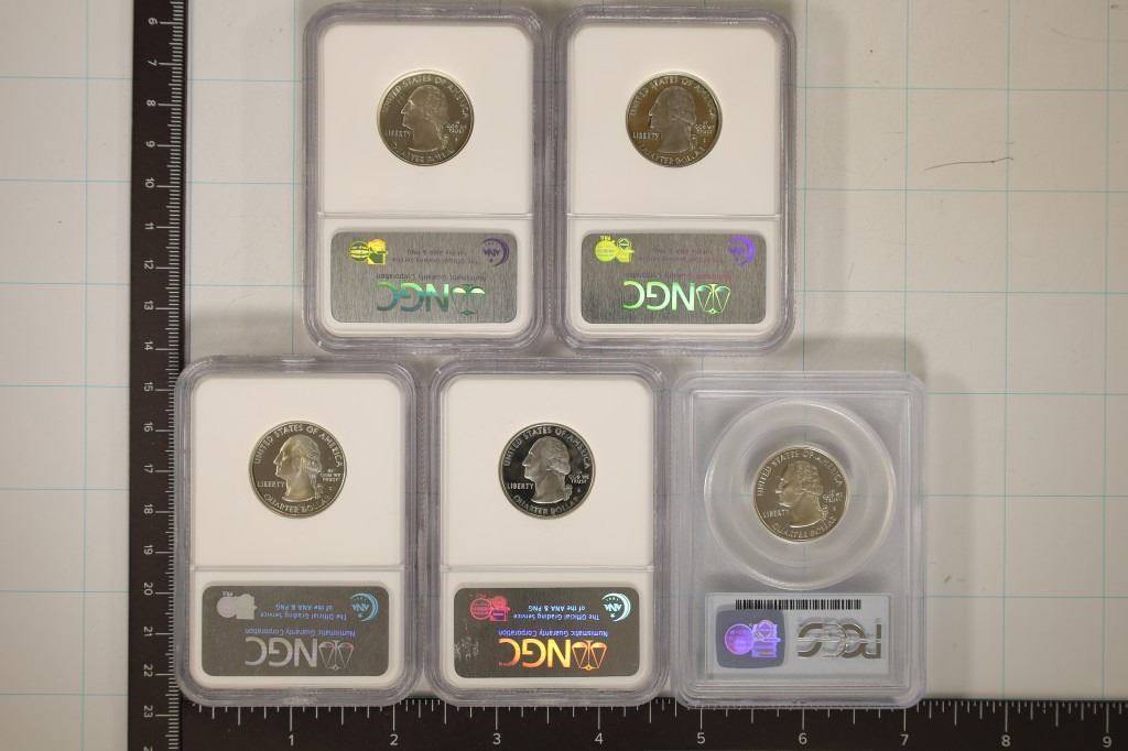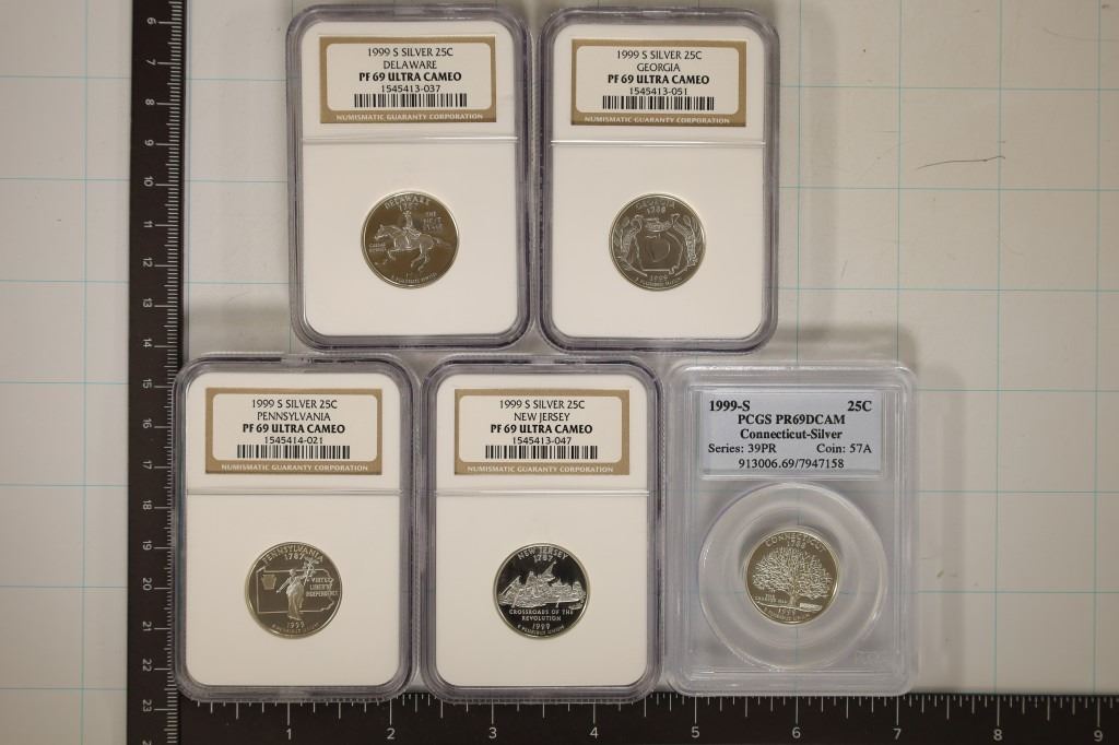 CONNETICUT PCGS PR69 DCAM, 1999-S SILVER PENNSYLVANIA NGC PF69 ULTRA CAM, 1999-S SILVER GEORGIA NGC PF69 ULTRA CAM, 1999-S SILVER DELAWARE NGC PF69 ULTRA CAM AND 1999-S SILVER NEW JERSEY NGC PF69 ULTRA CAM
