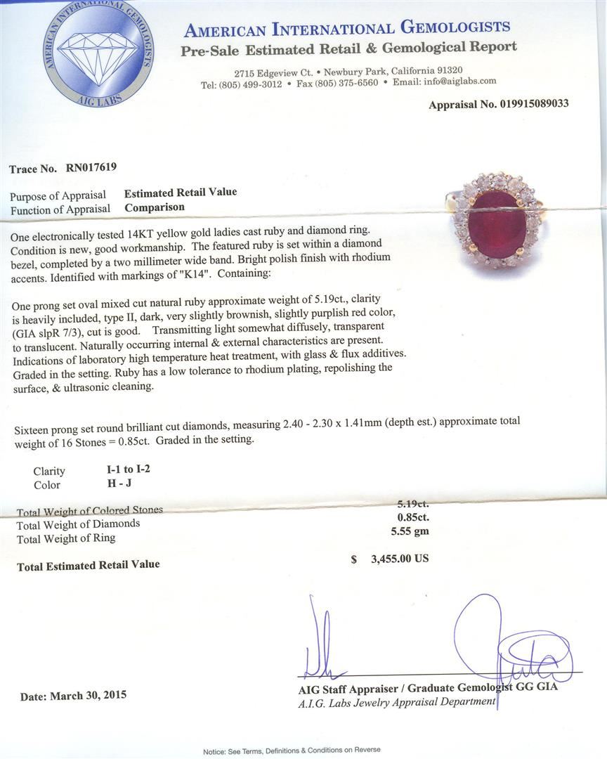 One electronically tested 14KT yellow gold ladies cast ruby and diamond ring. The featured ruby is set within a diamond bezel, completed by a two millimeter wide band. Bright polish finish with rhodium accents. Identified with markings of "K14". Condition is new, good workmanship. Containing: One prong set oval mixed cut natural ruby approximate weight of 5.19ct., clarity is heavily included, type II, dark, very slightly brownish, slightly purplish red color, (GIA slpR 7/3), cut is good. Transmitting light somewhat diffusely, transparent to translucent. Naturally occurring internal & external characteristics are present. Indications of laboratory high temperature heat treatment, with glass & flux additives. Graded in the setting. Ruby has a low tolerance to rhodium plating, repolishing the surface, & ultrasonic cleaning. Sixteen prong set round brilliant cut diamonds, measuring 2.40 - 2.30 x 1.41mm (depth est.) approximate total weight of 16 Stones = 0.85ct. Graded in the setting. Clarity: I-1 to I-2. Color: H - J. Total Weight of Colored Stones 5.19ct. Total Weight of Diamonds 0.85ct. AIG Appraised at $3,455.00.