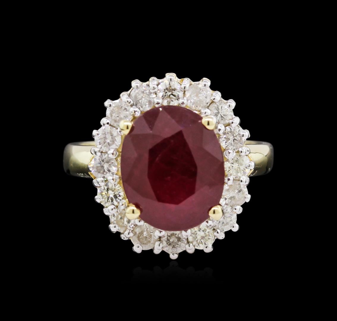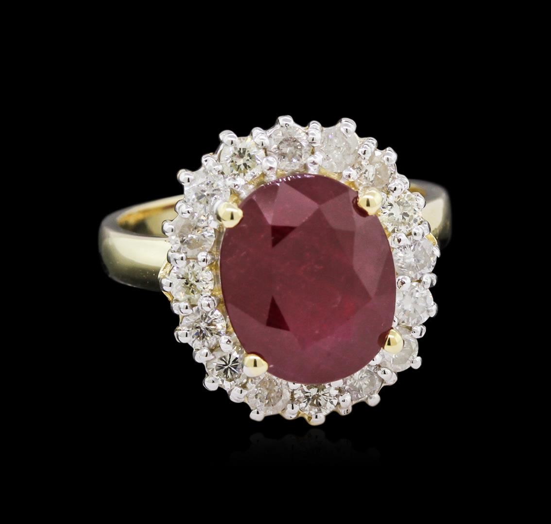 One electronically tested 14KT yellow gold ladies cast ruby and diamond ring. The featured ruby is set within a diamond bezel, completed by a two millimeter wide band. Bright polish finish with rhodium accents. Identified with markings of "K14". Condition is new, good workmanship. Containing: One prong set oval mixed cut natural ruby approximate weight of 5.19ct., clarity is heavily included, type II, dark, very slightly brownish, slightly purplish red color, (GIA slpR 7/3), cut is good. Transmitting light somewhat diffusely, transparent to translucent. Naturally occurring internal & external characteristics are present. Indications of laboratory high temperature heat treatment, with glass & flux additives. Graded in the setting. Ruby has a low tolerance to rhodium plating, repolishing the surface, & ultrasonic cleaning. Sixteen prong set round brilliant cut diamonds, measuring 2.40 - 2.30 x 1.41mm (depth est.) approximate total weight of 16 Stones = 0.85ct. Graded in the setting. Clarity: I-1 to I-2. Color: H - J. Total Weight of Colored Stones 5.19ct. Total Weight of Diamonds 0.85ct. AIG Appraised at $3,455.00.