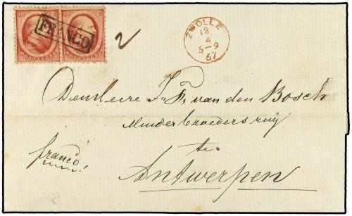 5(2) 1867 ZWOLLE a ANVERS (Bélgica). 10 cts. carmin (2). MAGNIFICA.