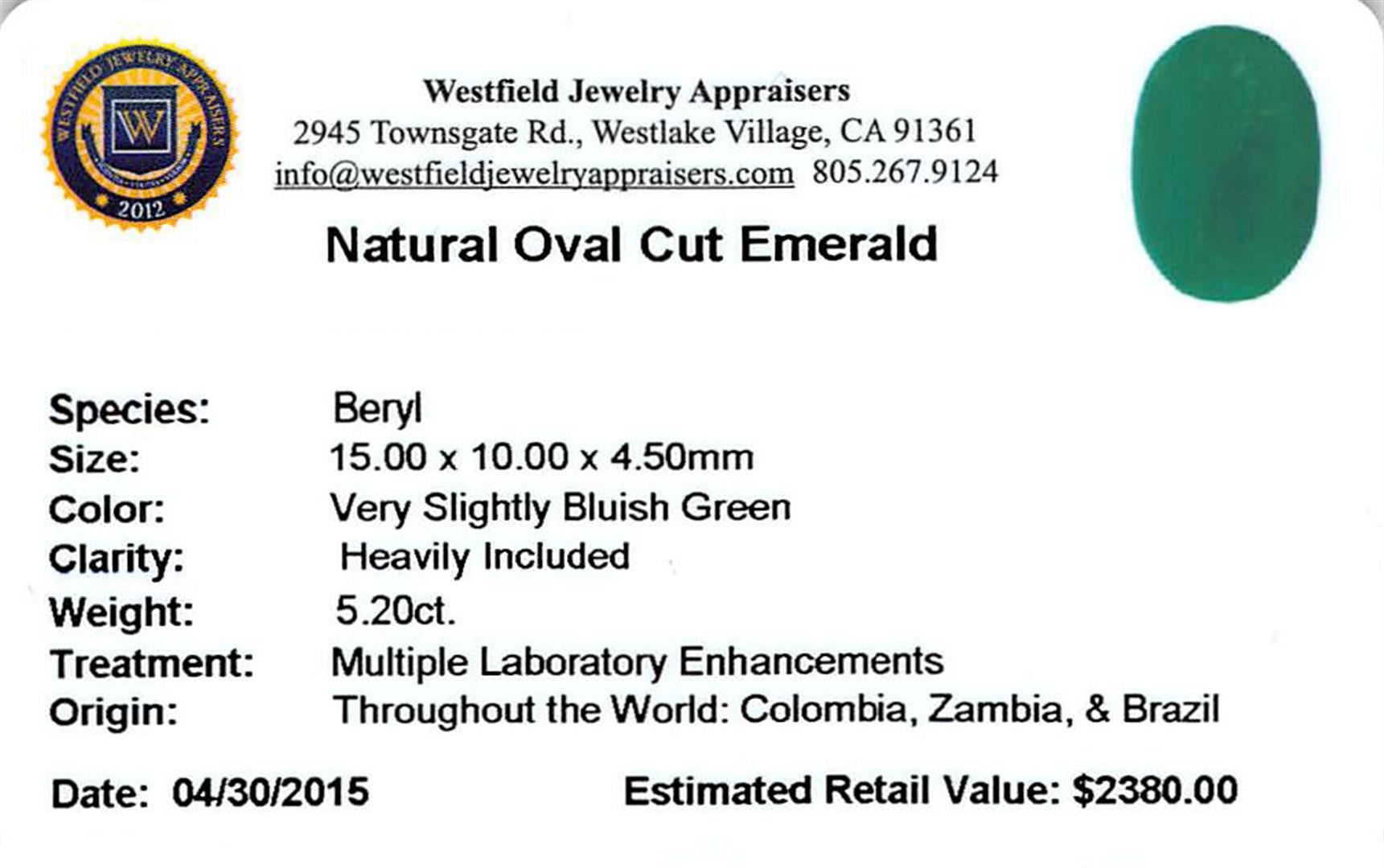 One oval cut natural emerald, measuring 15.00 x 10.20 x 4.50mm, exact weight 5.20ct., clarity is heavily included, type III, medium dark, very slightly grayish, very slightly bluish green color, (GIA vslbG 6/3), cut is good. Westfield Appraised at $2,380.00.