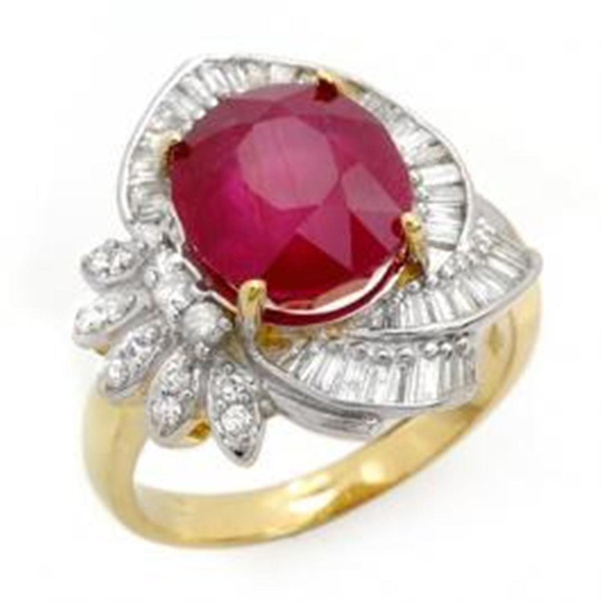 Diamond: 13 RD & BGT cut @ 1.05 ctw Clarity: SI-I Color: H-K Gemstone: Natural Ruby Gemstone color: RedGemstone quality: Good-to-Very Good Gemstone Cut & Weight: 1 Oval cut @ 4.15 ctw Metal Purity & Color : 14K Gold-Yellow Gold weight: 6.80 grams Ring size (US): 6.5Dimension: Approx. 3/4" x 7/8"
