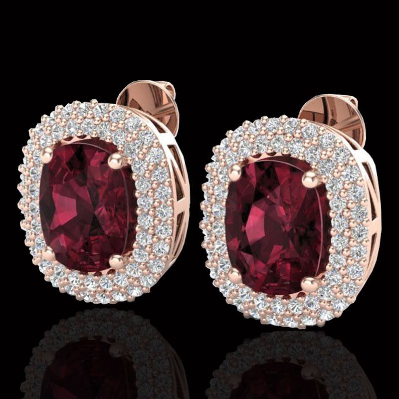 REF-97T5M -20114 ---- 5.20 CTW Garnet & Micro Pave VS/SI Diamond Halo Earrings 10K Rose Gold ---- Luxury Designer Brand Earring Appraised at $6,950 Certificate Number US20114 10k Rose gold, Earring Size is 9/16 Inches, Earring measuring approx. 1/2" X 9/16" , weighing in total approx. 6 grams. Made in the USA and is stamped 10k, Main stone 4.2 carat total weight containing 2 pieces of Saturated purplish Red color with AAA quality Cushion shape cut Garnet , Stone #2 1 carat total weight containing 116 pieces of H-I color with VS/SI quality Round shape cut Diamond
