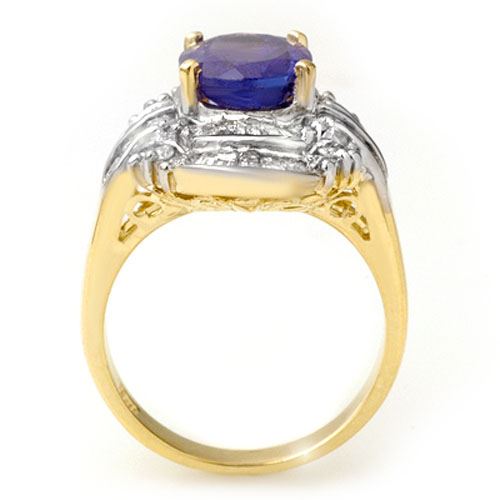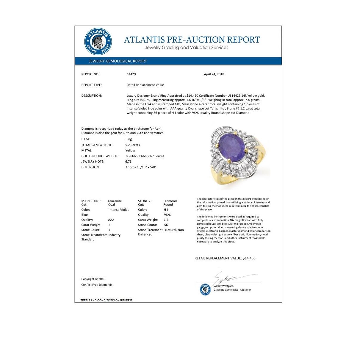 REF-187H6A -14429 ---- 5.20 CTW Tanzanite & Diamond Ring 14K Yellow Gold ---- Luxury Designer Brand Ring Appraised at $14,450 Certificate Number US14429 14k Yellow gold, Ring Size is 6.75, Ring measuring approx. 13/16" x 5/8" , weighing in total approx. 7.4 grams. Made in the USA and is stamped 14k, Main stone 4 carat total weight containing 1 pieces of Intense Violet Blue color with AAA quality Oval shape cut Tanzanite , Stone #2 1.2 carat total weight containing 56 pieces of H-I color with VS/SI quality Round shape cut Diamond