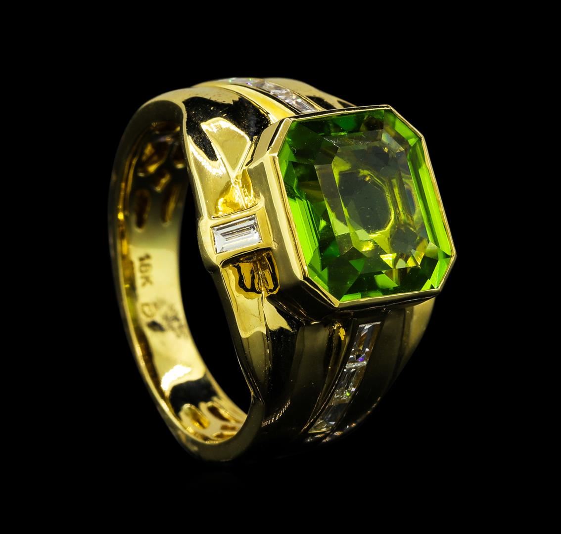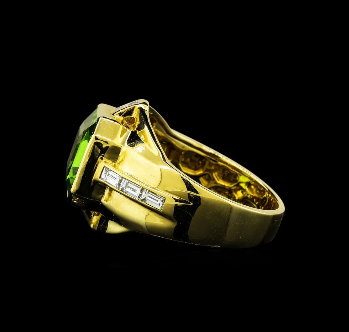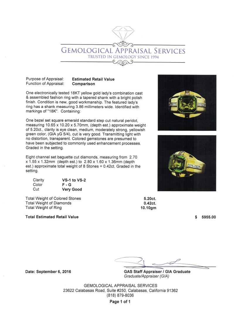 One electronically tested 18KT yellow gold lady's combination cast & assembled fashion ring with a tapered shank with a bright polish finish. The featured lady's ring has a shank measuring 3.86 millimeters wide. Identified with markings of '18K'. Condition is new, good workmanship. Containing: One bezel set square emerald standard step cut natural peridot, measuring 10.65 x 10.20 x 5.70mm, (depth est.) approximate weight of 5.20ct., clarity is eye clean, medium, moderately strong, yellowish green color, (GIA yG 5/4), cut is very good. Transmitting light with no distortion, transparent. Colored gemstones are presumed to have been subjected to commonly used enhancement processes. Graded in the setting. Eight channel set baguette cut diamonds, measuring from 2.70 x 1.55 x 1.32mm (depth est.) to 2.80 x 1.60 x 1.36mm (depth est.) approximate total weight of 8 Stones = 0.42ct. Graded in the setting. Clarity VS-1 to VS-2. Color: F - G Cut Very Good. Total Weight of Colored Stones 5.20ct.. Total Weight of Diamonds 0.42ct.. Total Weight of Ring 10.10gm GAS Appraised at $5,955.00.