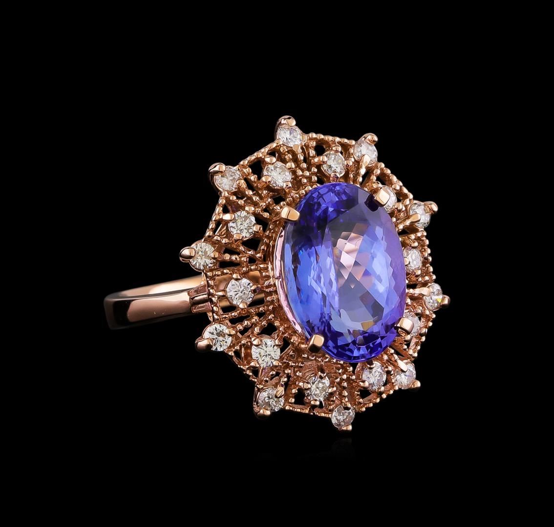 One electronically tested 14KT rose gold lady's cast fashion ring with a basket halo with a bright polish finish. The featured lady's has a shank measuring 2.61 millimeters in width. Identified with markings of "K14". Condition is new, good workmanship. Containing: One prong set oval modified brilliant cut natural tanzanite, measuring 12.30 x 8.90 x 6.20mm, (depth est.) 5%. bulge factor, approximate weight of 5.20ct., clarity is eye clean, medium, moderately strong, violetish blue color, (GIA vB 5/4), cut is very good. Transmitting light with no distortion, transparent. Colored gemstones are presumed to have been subjected to commonly used enhancement processes. Graded in the setting. Twenty prong set round brilliant cut diamonds, measuring 1.90 - 1.80 x 1.15mm (depth est.) approximate total weight of 20 Stones = 0.50ct. Graded in the setting. Clarity: SI-1 to SI-2. Color: H - I. Cut Good. Total Weight of Colored Stones 5.20ct. Total Weight of Diamonds 0.50ct. Total Weight of Ring 6.50gm. GAS Appraised.