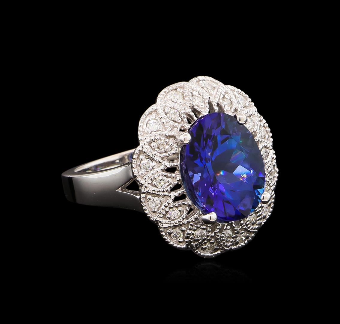 One electronically tested 14KT white gold lady's cast fashion ring with a scalloped basket halo with a bright polish with milgrain detailing finish. The featured lady's ring has a shank measuring 2.38 millimeters wide. Identified with markings of "14K". Condition is new, good workmanship. Containing: One prong set oval modified brilliant cut natural tanzanite, measuring 11.90 x 9.57 x 7.09mm, approximate weight of 5.20ct., clarity is eye clean, type I, medium dark, strong, violetish blue color, (GIA vB 6/5), cut is very good. Transmitting light with no distortion, transparent. Colored gemstones are presumed to have been subjected to commonly used enhancement processes. Graded in the setting. Twenty-Four prong set round brilliant cut diamonds, measuring 1.40 - 1.35 x 0.86mm (depth est.) approximate total weight of 24 Stones = 0.24ct. Graded in the setting. Clarity: SI-1 to SI-2. Color: G - I. Cut Good. Total Weight of Colored Stones 5.20ct. Total Weight of Diamonds 0.24ct. Total Weight of Ring 7.50gm. GAS Appraised at $10,715.00.