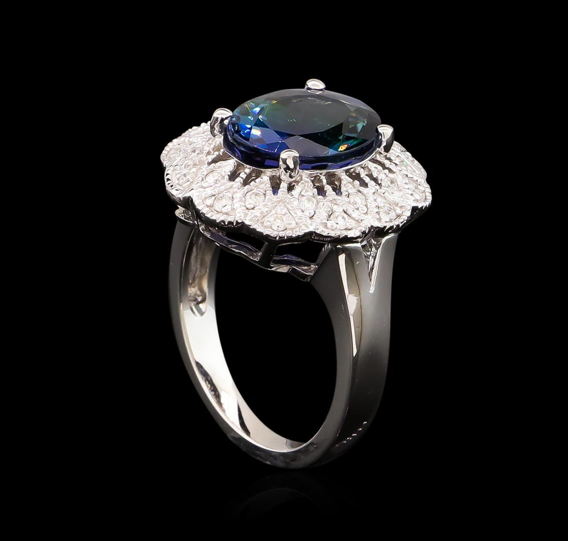 One electronically tested 14KT white gold lady's cast fashion ring with a scalloped basket halo with a bright polish with milgrain detailing finish. The featured lady's ring has a shank measuring 2.38 millimeters wide. Identified with markings of "14K". Condition is new, good workmanship. Containing: One prong set oval modified brilliant cut natural tanzanite, measuring 11.90 x 9.57 x 7.09mm, approximate weight of 5.20ct., clarity is eye clean, type I, medium dark, strong, violetish blue color, (GIA vB 6/5), cut is very good. Transmitting light with no distortion, transparent. Colored gemstones are presumed to have been subjected to commonly used enhancement processes. Graded in the setting. Twenty-Four prong set round brilliant cut diamonds, measuring 1.40 - 1.35 x 0.86mm (depth est.) approximate total weight of 24 Stones = 0.24ct. Graded in the setting. Clarity: SI-1 to SI-2. Color: G - I. Cut Good. Total Weight of Colored Stones 5.20ct. Total Weight of Diamonds 0.24ct. Total Weight of Ring 7.50gm. GAS Appraised at $10,715.00.