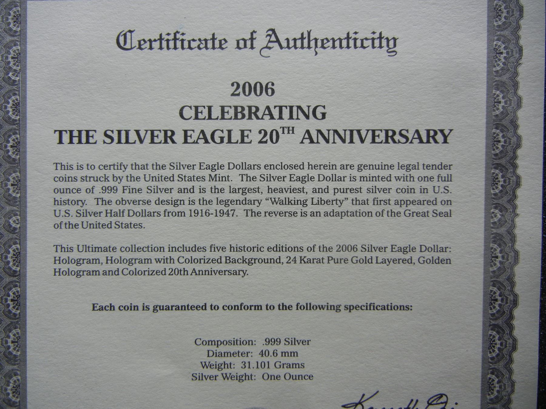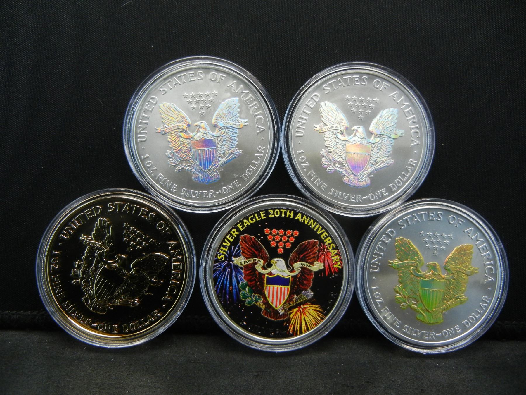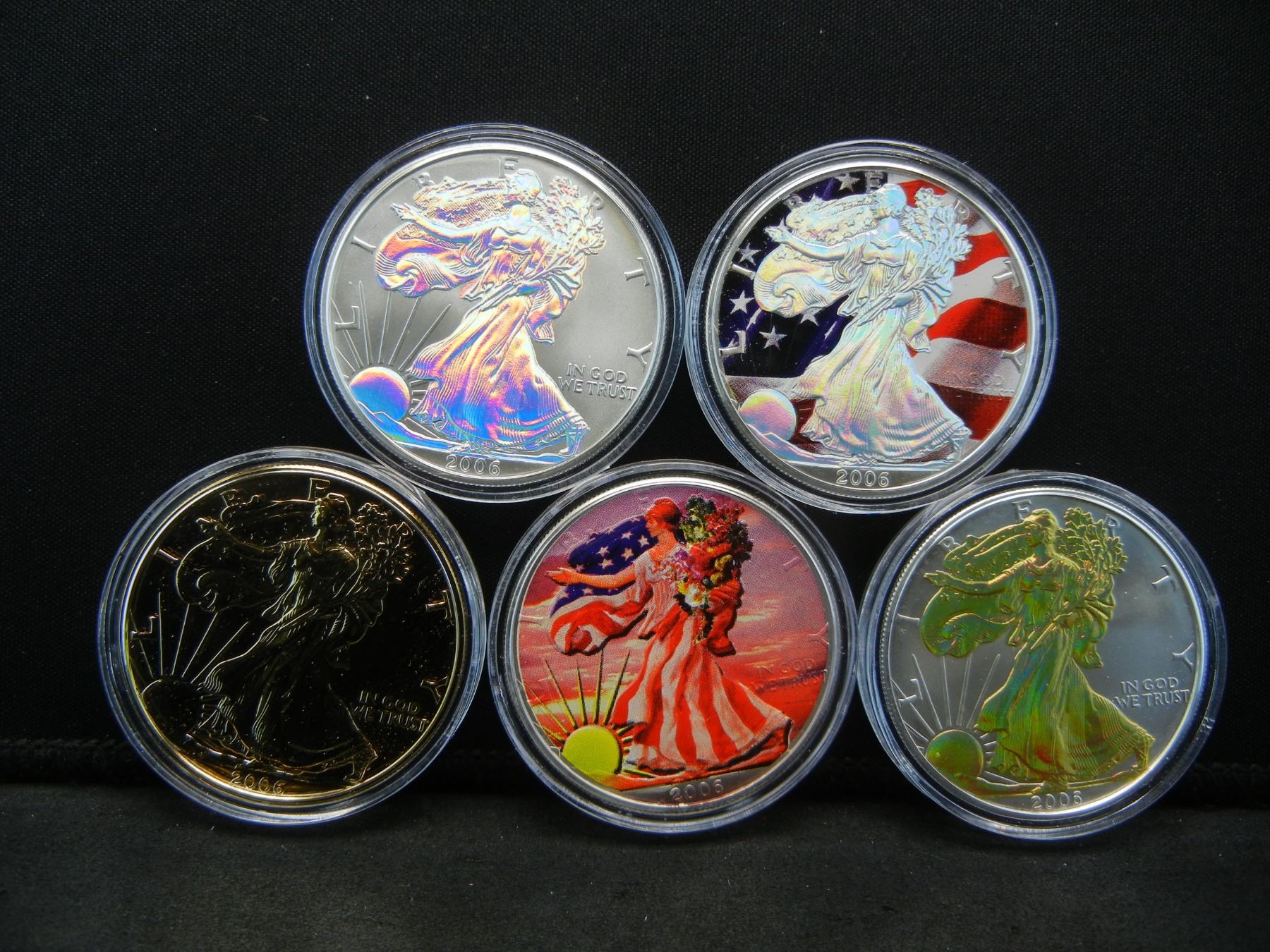(5) 2006 Amercian Silver Eagles Hologramed, Colorized, Gold Plated in Very Nice Display Box