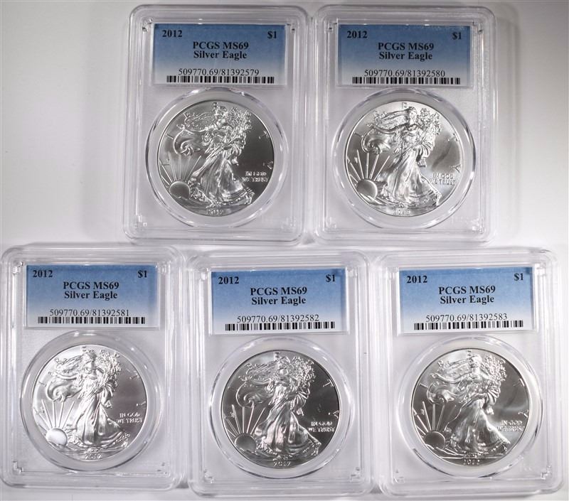5-2012 AMERICAN SIVER EAGLES, PCGS MS-69 ESTIMATE $250 - $275.