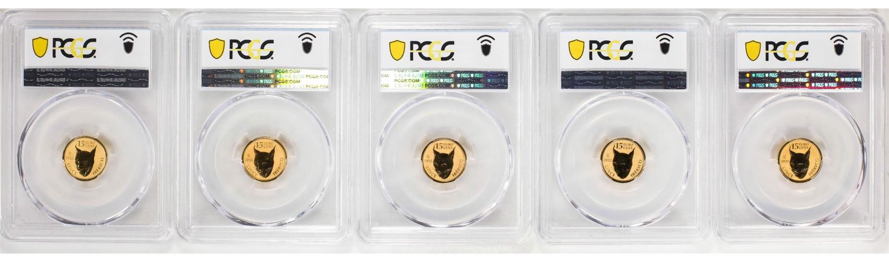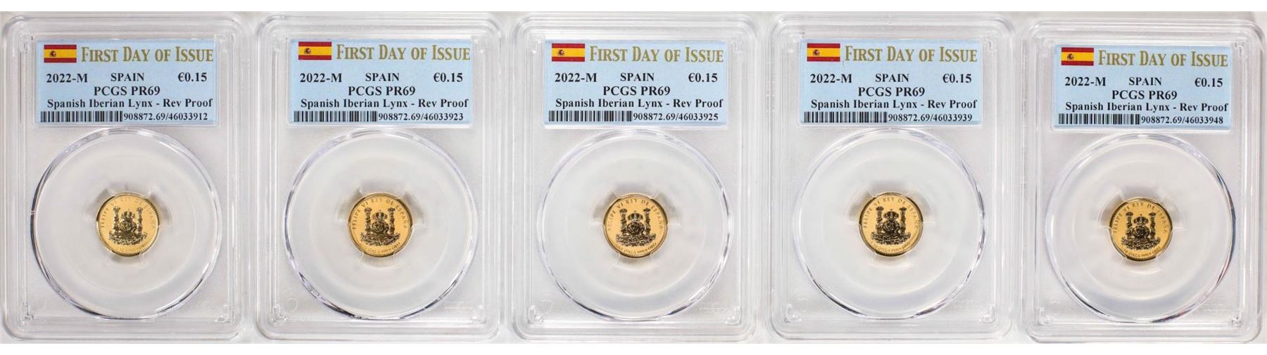 One Lot of (5) 2022M Spain 15 Euro Cent Reverse Proof Lynx Gold Doubloon Coins PCGS PR69 FDOI. PCGS Graded.