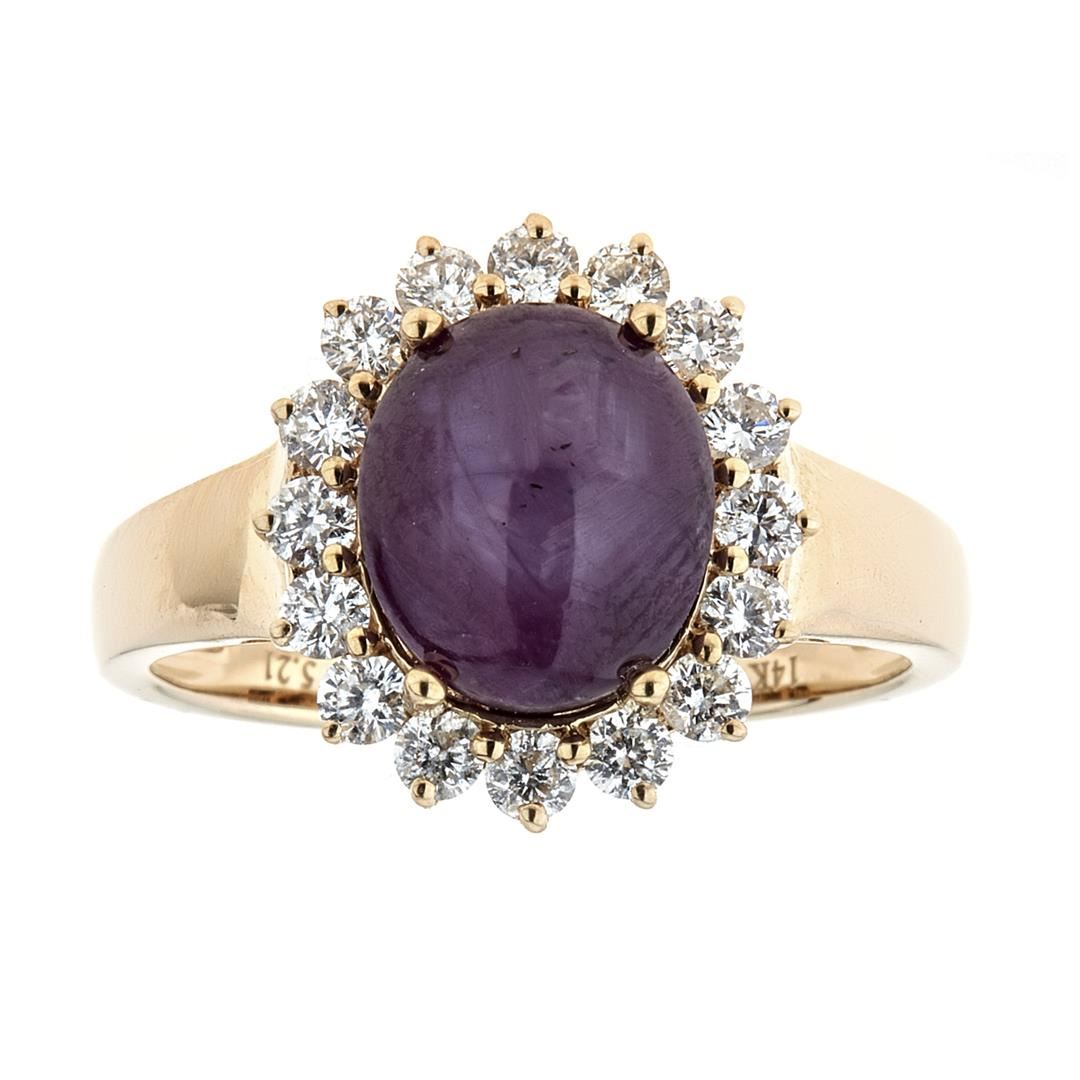 One Lady's Star Ruby and Diamond Ring. Setting: 14 KT Yellow Gold Mounting. Additional: 16 Round Diamonds = 0.55 Cts. TWT (G-H/SI). Center Gem Stone Information: Species: Natural Corundum. Variety: Star Ruby. Phenomenon: Asterism (6 Ray Star). Shape and Cut: Cabochon. Measurements: 9.17 x 7.92 x 5.93 mm. Weight: 5.21 Carats. Transparency: Semi-Translucent. Color Hue: Purplish Red. Saturation: Moderately Strong. Total Weight: 2.94 grams.