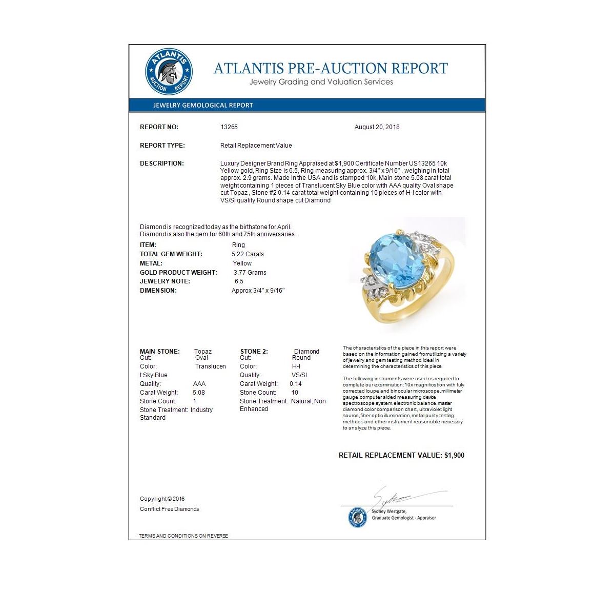 REF-29K3W -13265 ---- 5.22 CTW Blue Topaz & Diamond Ring 10K Yellow Gold ---- Luxury Designer Brand Ring Appraised at $1,900 Certificate Number US13265 10k Yellow gold, Ring Size is 6.5, Ring measuring approx. 3/4" x 9/16" , weighing in total approx. 2.9 grams. Made in the USA and is stamped 10k, Main stone 5.08 carat total weight containing 1 pieces of Translucent Sky Blue color with AAA quality Oval shape cut Topaz , Stone #2 0.14 carat total weight containing 10 pieces of H-I color with VS/SI quality Round shape cut Diamond