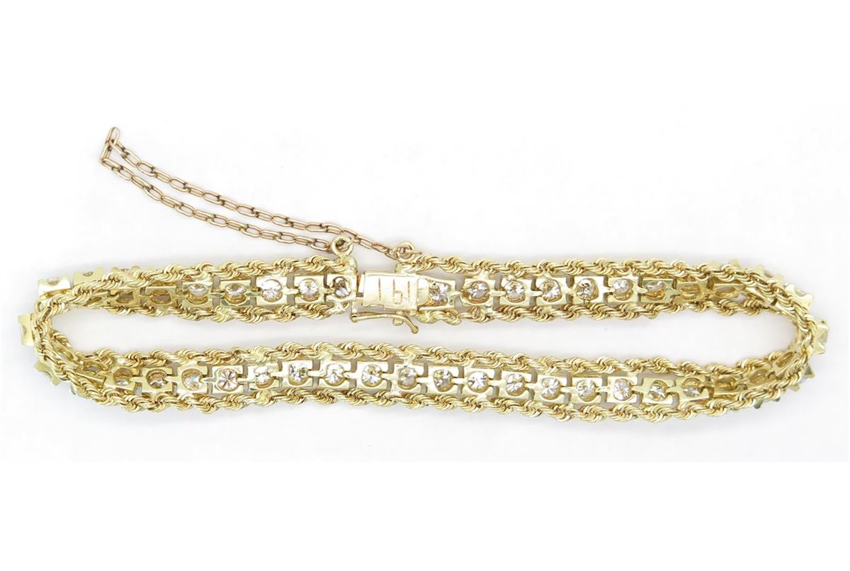 One tested 14K yellow gold diamond bracelet. Condition is new. Containing: 46 round Brilliant Cut Diamonds. Clarity: I-SI, Color: G-I. Approximate Total diamond weight: 5.22CTW. Diamonds are graded in the mounting, unless otherwise stated. Weight of bracelet: 18.6 grams. Size: 7.5"