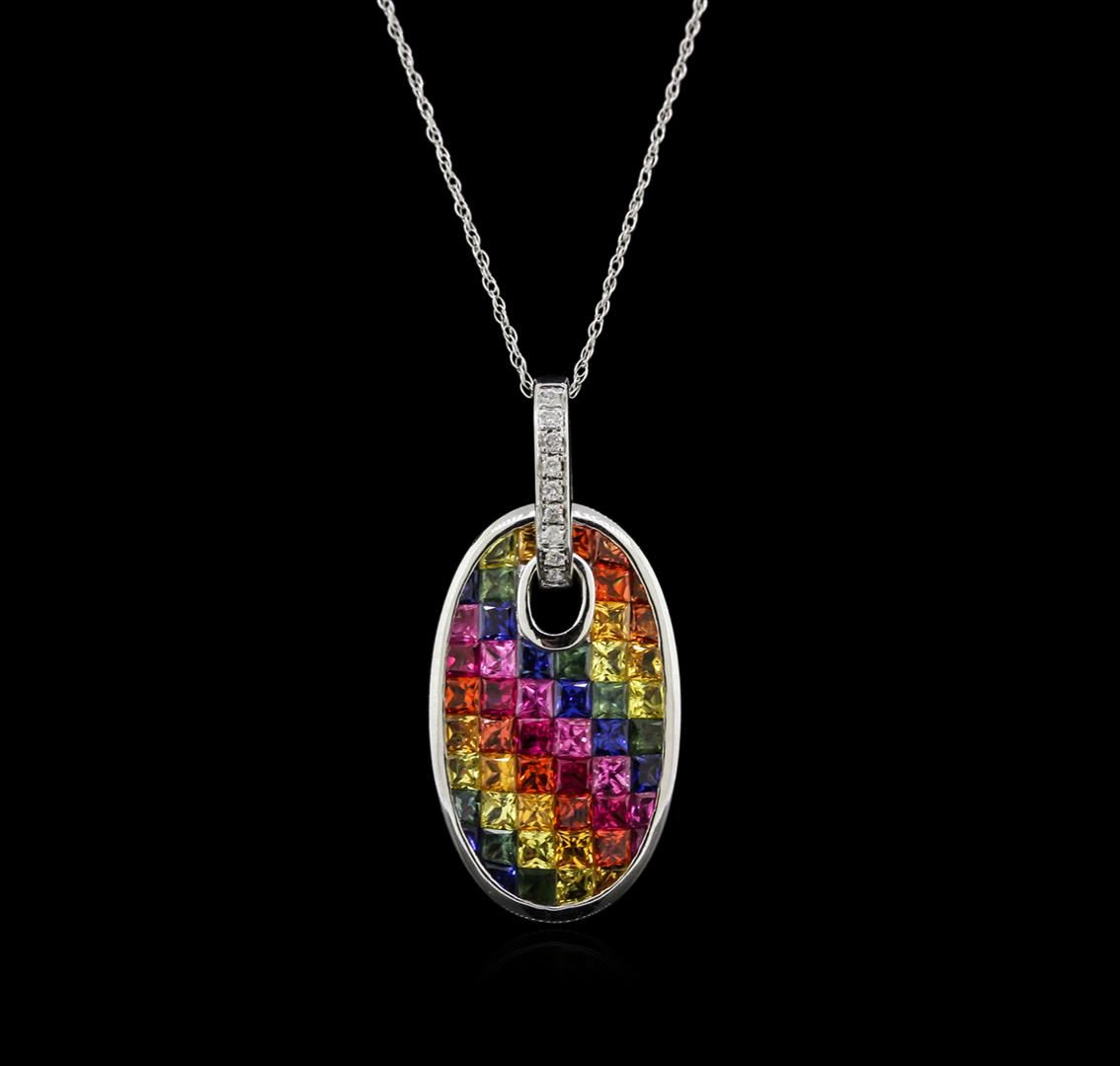 One pendant with chain featuring: 14KT white gold weighing 5.20 grams containing multi-colored sapphires with a total weight of 5.22ct and diamonds with a total weight of 0.06ct.