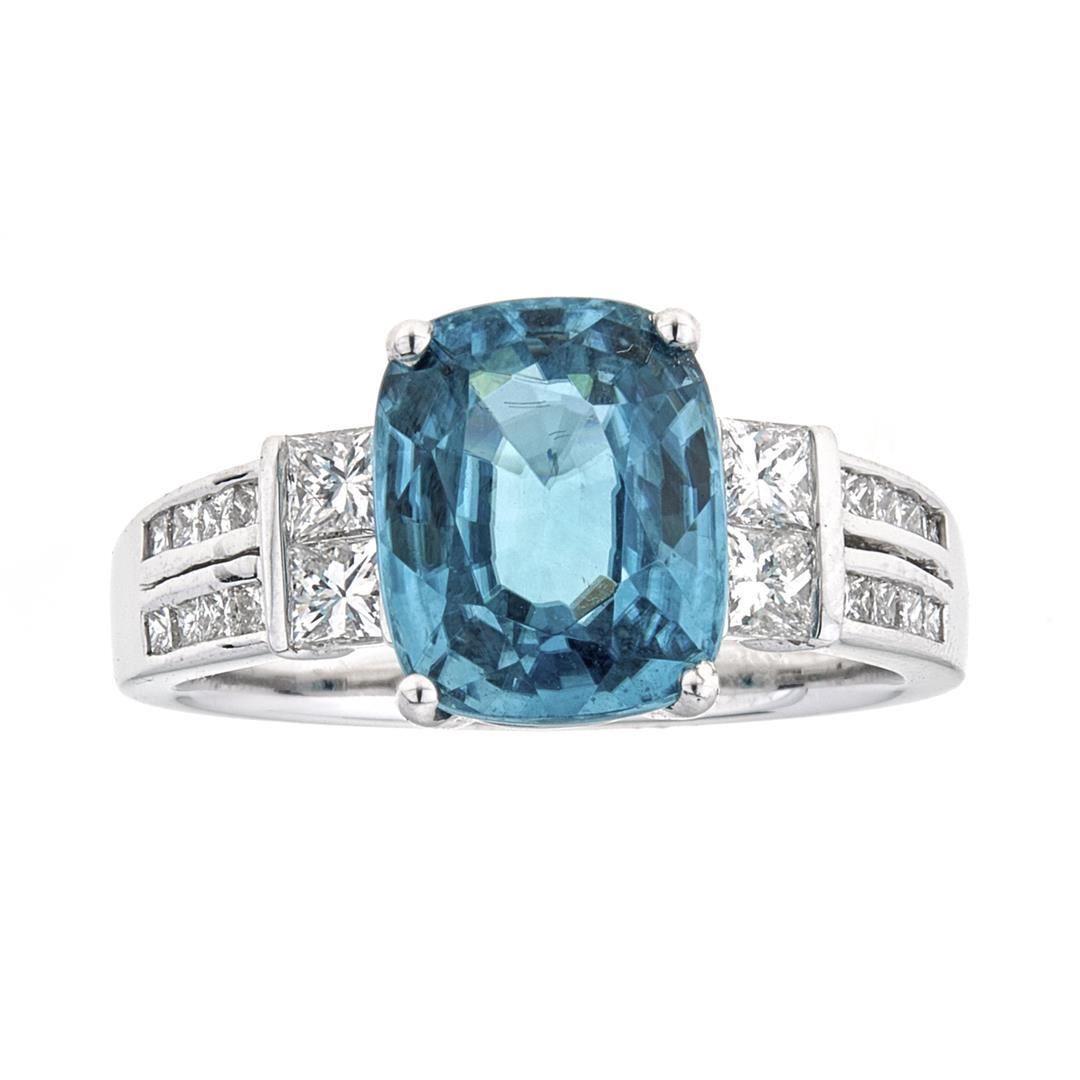 One Lady's Blue Zircon and Diamond ring. Setting: 14kt white gold mounting. Additional: 20 princess cut diamonds = 0.65cts TWT(G-H/VS-SI). Center gem stone information; Species: natural zircon. Variety: zircon. Shape and cut: cushion mixed cut. Measurements: 10.15 x x8.20 x x5.26mm. Weight: 5.23 carats. Transparency: transparent. Color Hue: blue. Saturation: moderately strong. Total Weight: 4.01 grams.