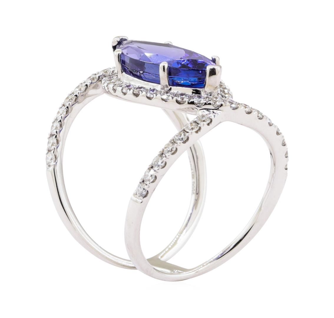 One electronically tested 18KT white gold ladies cast & assembled tanzanite & diamond ring. The featured tanzanite is set within a diamond bezel, supported by diamond ribbon shoulders that attach in the back to create an eight millimeter wide band. Bright polish finish. Trademark is HANA. Identified with markings of "18K". Condition is new, good workmanship. Containing: One prong set marquise mixed cut natural tanzanite, measuring 16.00 x 7.90 x 6.20mm, approximate weight of 5.24ct., clarity is slightly included, type I, medium dark, strong, violetish blue color, (GIA vB 6/5), cut is good. Transmitting light with a minimum of distortion, transparent. Naturally occurring internal & external characteristics are present. Graded in the setting. Tanzanite is a very rare gemstone that is only found in the country of Tanzania. Originally discovered in 1967. Tiffany & Company, named the stone Tanzanite. It is found in the Usumburu Mountains that border the Umba Valley of northern Tanzania. Tanzanite occurs in gray, brown, violet, blue, reddish-purple, & green. The gem is interesting because of its exceptional pleochroism. Rotated in different directions a tanzanite will exhibit multiple changes of color. Tanzanite has a low tolerance to ultrasonic cleaning, and should not be cleaned using this method. Forty prong set round brilliant cut diamonds approximate total weight of 40 Stones = 0.95ct. The clarity & color grade reflect the overall average for the group. Graded in the setting. Clarity SI-1 to I-1 Color F - H Total Weight of Colored Stones 5.24 ct. Total Weight of Diamonds 0.95 ct. Total Weight of Ring 6.80 gm Estimated Retail Value $ 17,270.00 US