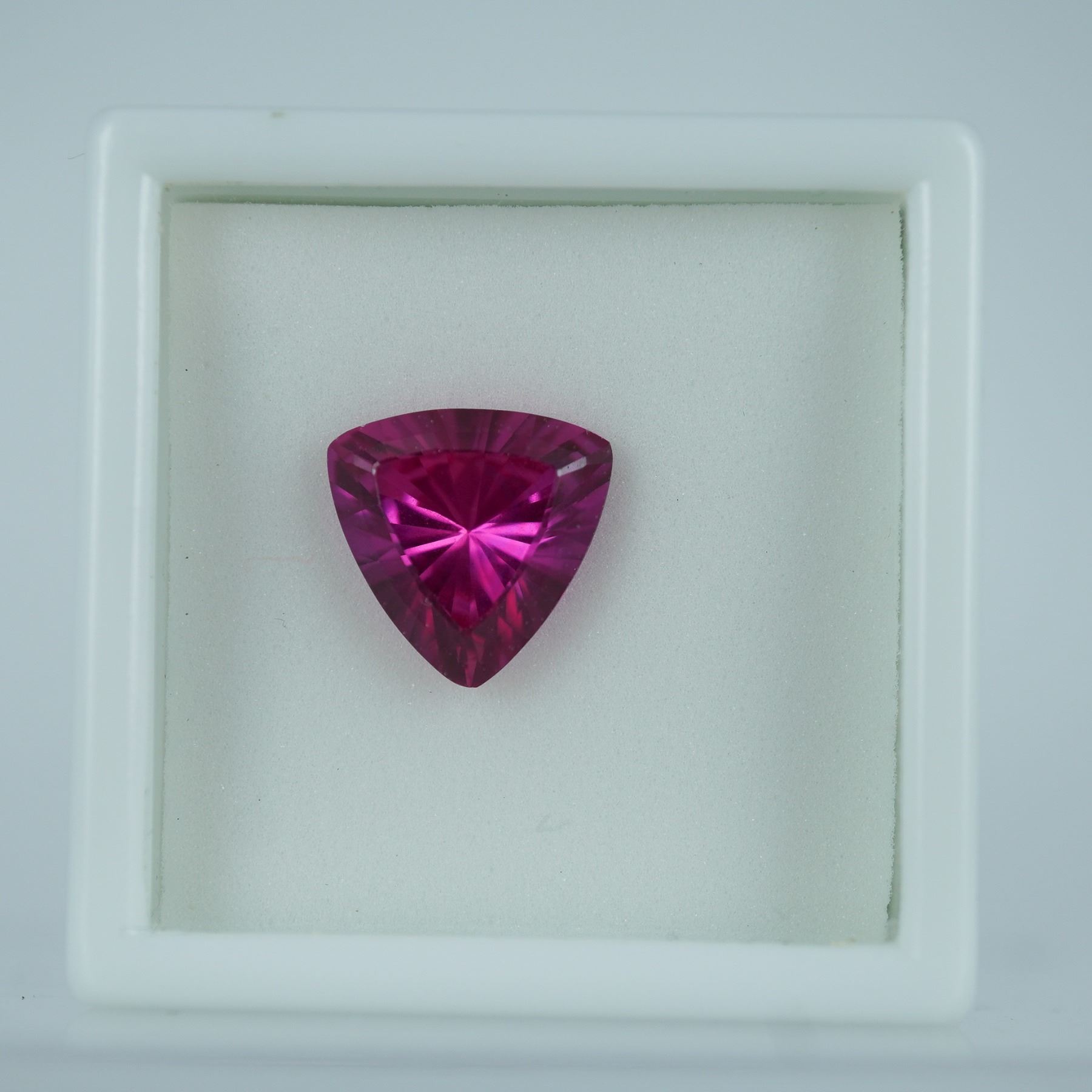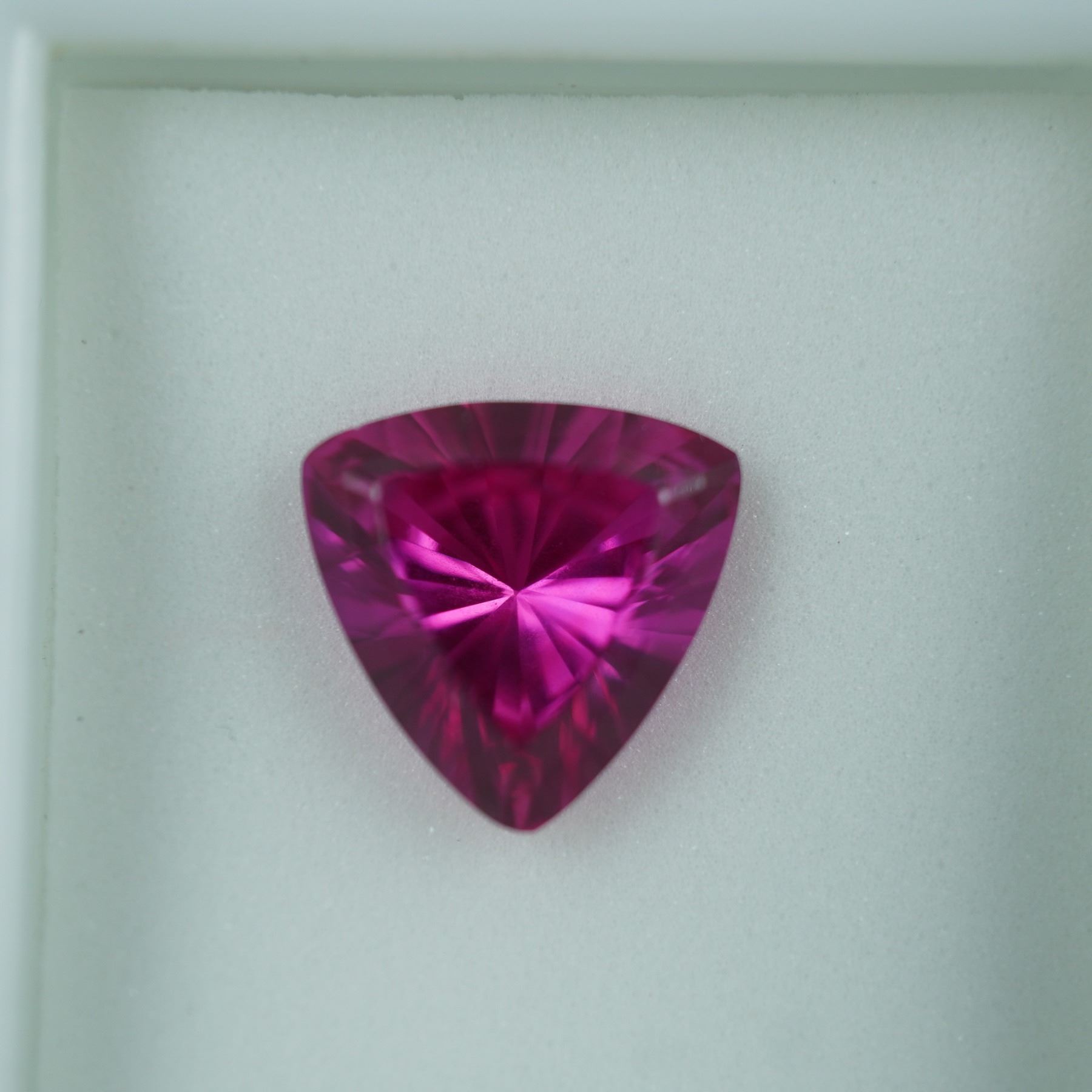 This vibrant 5.25-carat lab-created purple sapphire features a striking trillion cut with excellent clarity and brilliance. The gemstone's vivid purple hue creates a stunning visual appeal, making it an ideal choice for custom jewelry designs. Its bold, captivating color and sparkle will make it a standout addition to any piece.
