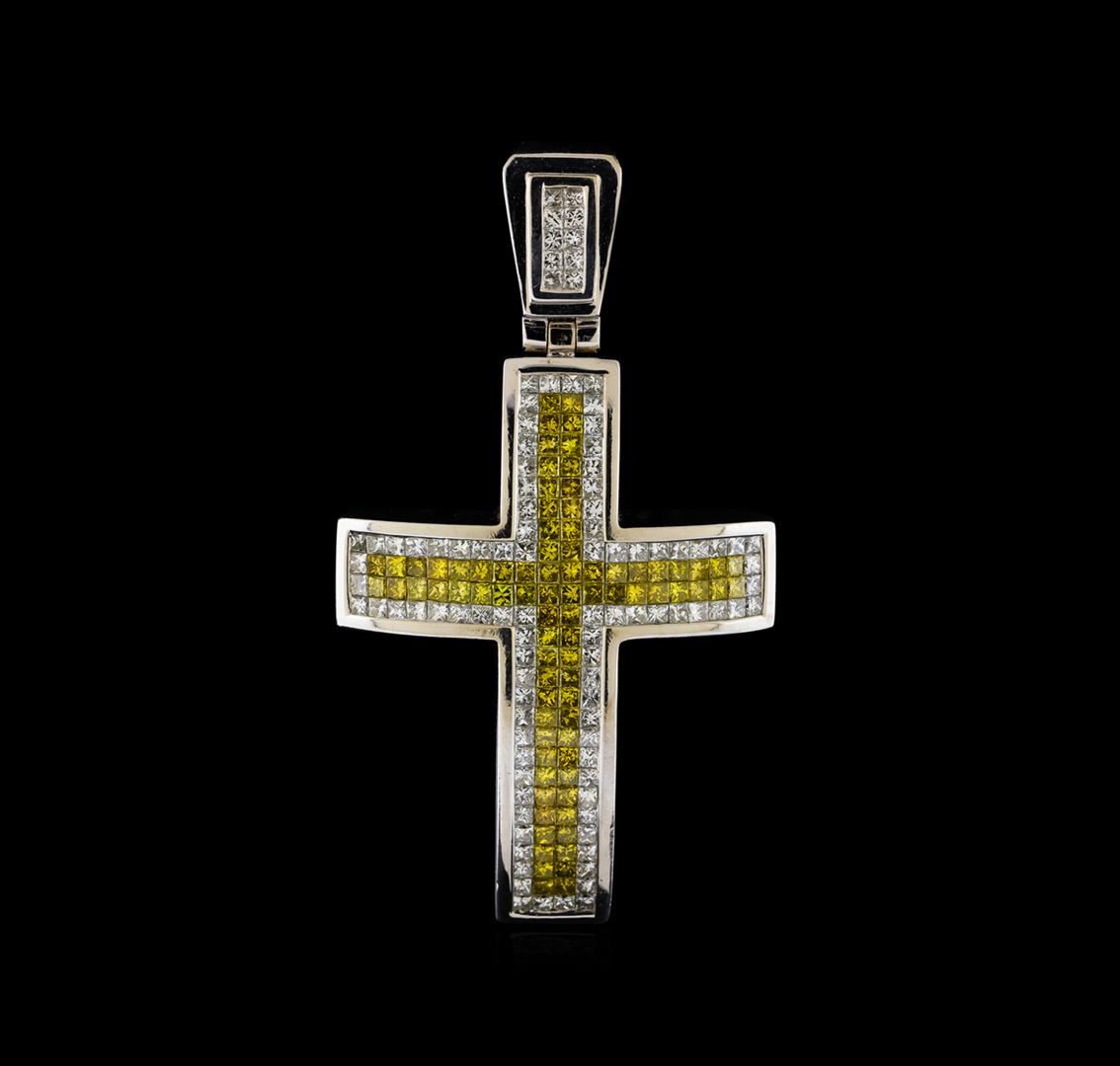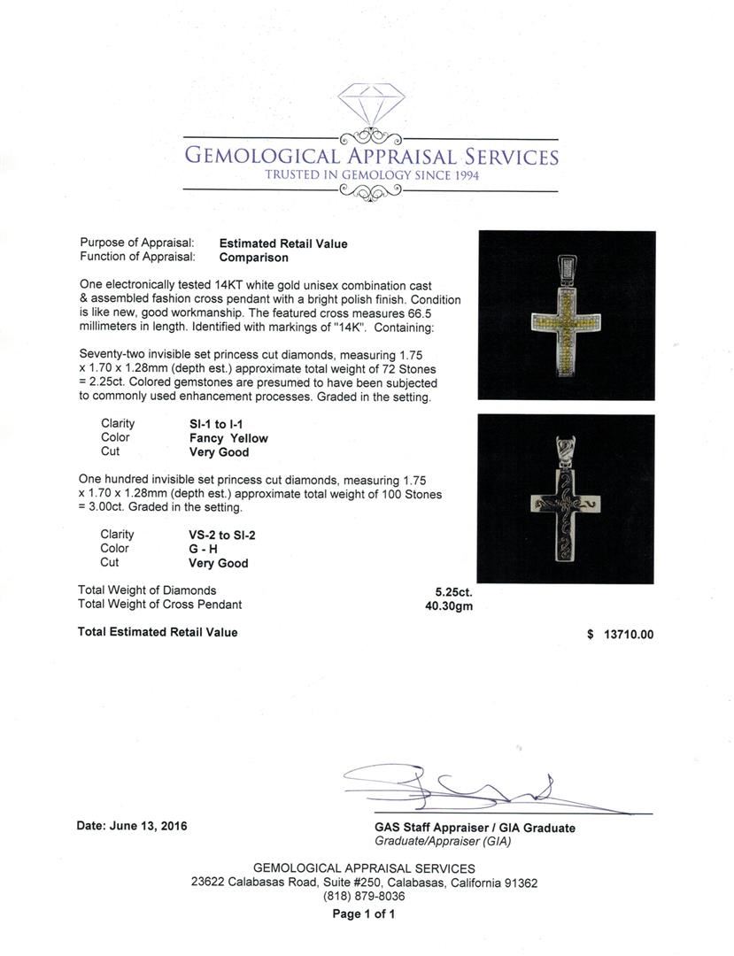 One electronically tested 14KT white gold unisex combination cast & assembled fashion cross pendant with a bright polish finish. The featured cross measures 66.5 millimeters in length. Identified with markings of "14K". Condition is like new, good workmanship. Containing: Seventy-Two invisible set princess cut diamonds, measuring 1.75 x 1.70 x 1.28mm (depth est.) approximate total weight of 72 Stones = 2.25ct. Colored gemstones are presumed to have been subjected to commonly used enhancement processes. Graded in the setting. Clarity: SI-1 to I-1 Cut Very Good One Hundred invisible set princess cut diamonds, measuring 1.75 x 1.70 x 1.28mm (depth est.) approximate total weight of 100 Stones = 3.00ct. Graded in the setting. Clarity: VS-2 to SI-2. Color: G - Very Good. Total Weight of Diamonds 5.25ct. Total Weight of Cross Pendant 40.30gm. GAS Appraised at $13,710.00.