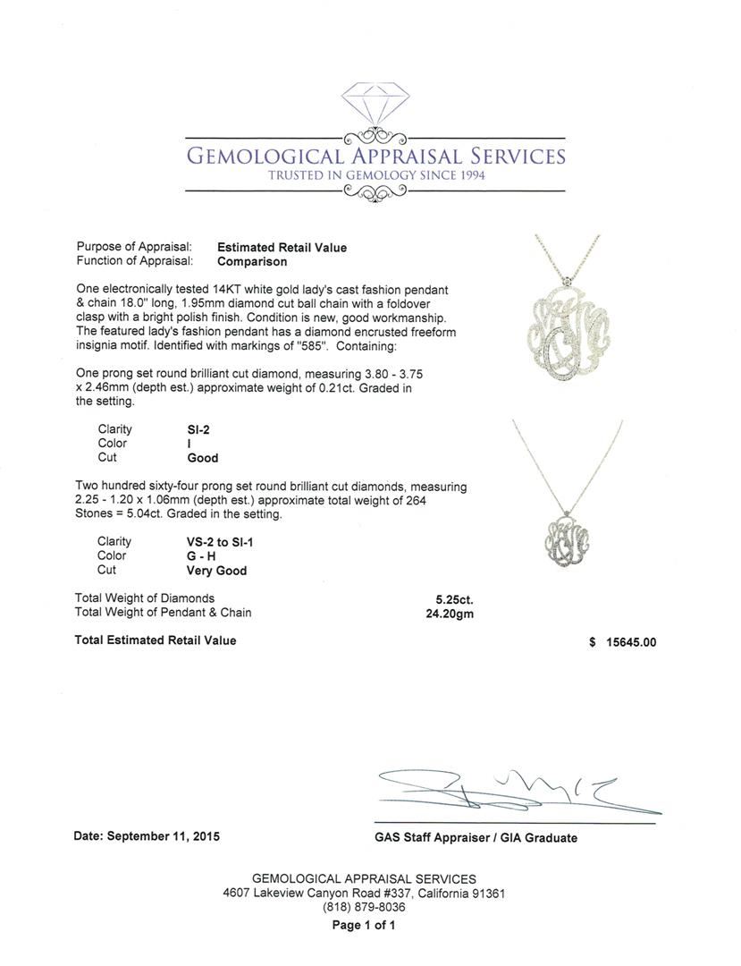 One electronically tested 14KT white gold lady's cast fashion pendant & chain 18.0" long, 1.95mm diamond cut ball with a foldover clasp with a bright polish finish. The featured lady's fashion pendant has a diamond encrusted freeform insignia motif. Identified with markings of "585". Condition is new, good workmanship. Containing: One prong set round brilliant cut diamond, measuring 3.80 - 3.75 x 2.46mm (depth est.) approximate weight of 0.21ct. Graded in the setting. Clarity: SI-2. Color: I. Cut Good Two Hundred Sixty-Four prong set round brilliant cut diamonds, measuring 2.25 - 1.20 x 1.06mm (depth est.) approximate total weight of 264 Stones = 5.04ct. Graded in the setting. Clarity: VS-2 to SI-1. Color: G - Very Good. Total Weight of Diamonds 5.25ct. Total Weight of Pendant & Chain 24.20gm. GAS Appraised at $15,645.00.