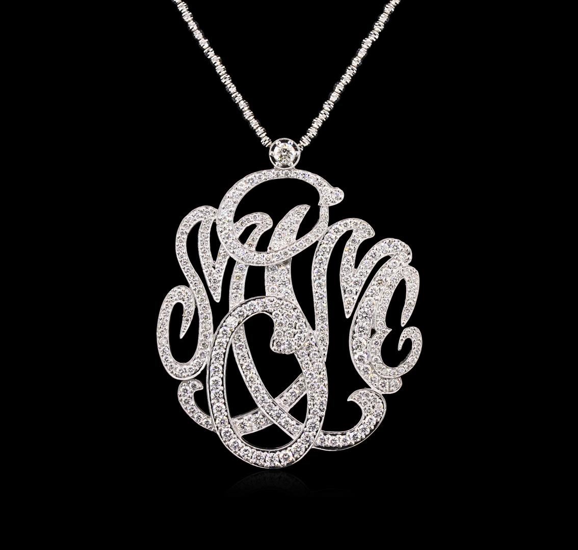 One electronically tested 14KT white gold lady's cast fashion pendant & chain 18.0" long, 1.95mm diamond cut ball with a foldover clasp with a bright polish finish. The featured lady's fashion pendant has a diamond encrusted freeform insignia motif. Identified with markings of "585". Condition is new, good workmanship. Containing: One prong set round brilliant cut diamond, measuring 3.80 - 3.75 x 2.46mm (depth est.) approximate weight of 0.21ct. Graded in the setting. Clarity: SI-2. Color: I. Cut Good Two Hundred Sixty-Four prong set round brilliant cut diamonds, measuring 2.25 - 1.20 x 1.06mm (depth est.) approximate total weight of 264 Stones = 5.04ct. Graded in the setting. Clarity: VS-2 to SI-1. Color: G - Very Good. Total Weight of Diamonds 5.25ct. Total Weight of Pendant & Chain 24.20gm. GAS Appraised at $15,645.00.