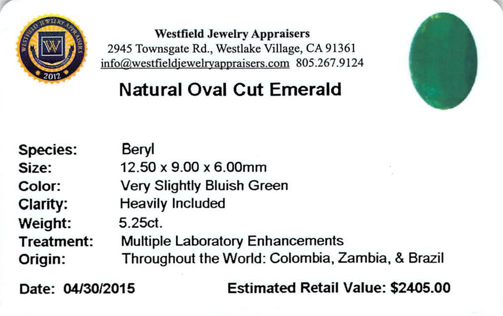 One oval mixed cut natural emerald approximate weight of 5.25ct., clarity is heavily included, type III, medium dark, very slightly grayish, very slightly bluish green color, (GIA vslbG 6/3), cut is good. Westfield Appraised at $2,405.00.