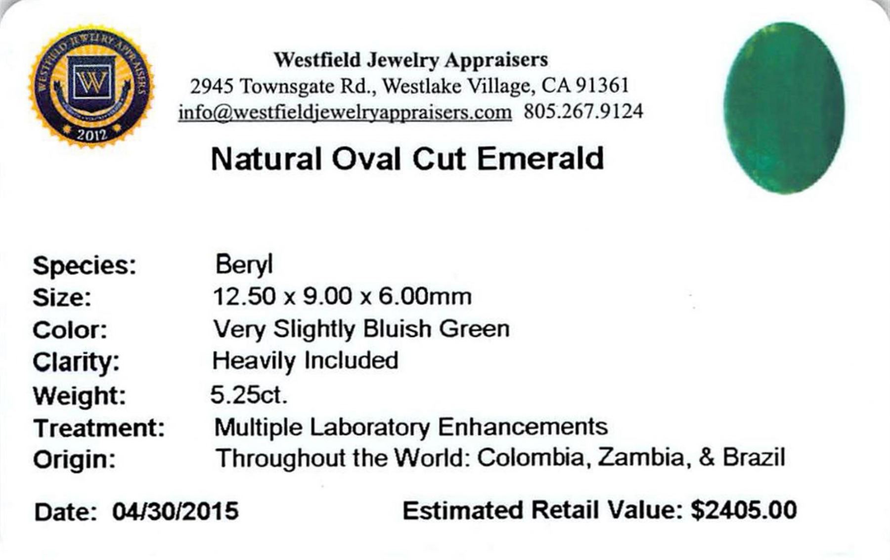 One oval mixed cut natural emerald approximate weight of 5.25ct., clarity is heavily included, type III, medium dark, very slightly grayish, very slightly bluish green color, (GIA vslbG 6/3), cut is good. Westfield Appraised.